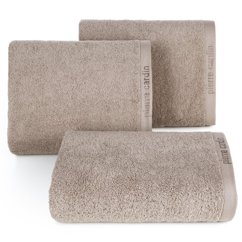 Jednokolorowy, klasyczny ręcznik kąpielowy z ekskluzywnej kolekcji Pierre Cardin zdobiony su btelną lamówką z logo projektanta. Wysokiej jakości tkanina. szerokość: 50 cm, długość: 90 cm, kolor: ciemnobeżowy, Gramatura: 430 GSM, Skład: 100% bawełna SZT.6