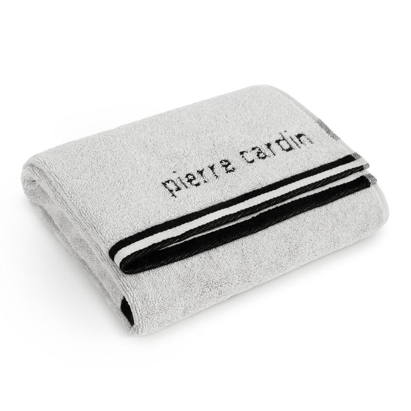 Jednokolorowy, klasyczny ręcznik kąpielowy z ekskluzywnej kolekcji Pierre Cardin zdobiony su btelną lamówką z logo projektanta. Wysokiej jakości tkanina. szerokość: 70 cm, długość: 140 cm, kolor: srebrny, Gramatura: 430 GSM, Skład: 100% bawełna SZT.3