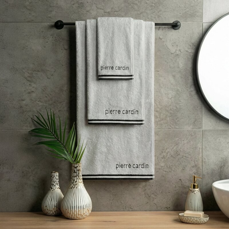 Jednokolorowy, klasyczny ręcznik kąpielowy z ekskluzywnej kolekcji Pierre Cardin zdobiony su btelną lamówką z logo projektanta. Wysokiej jakości tkanina. szerokość: 50 cm, długość: 90 cm, kolor: srebrny, Gramatura: 500 GSM, Skład: 100% bawełna SZT.6