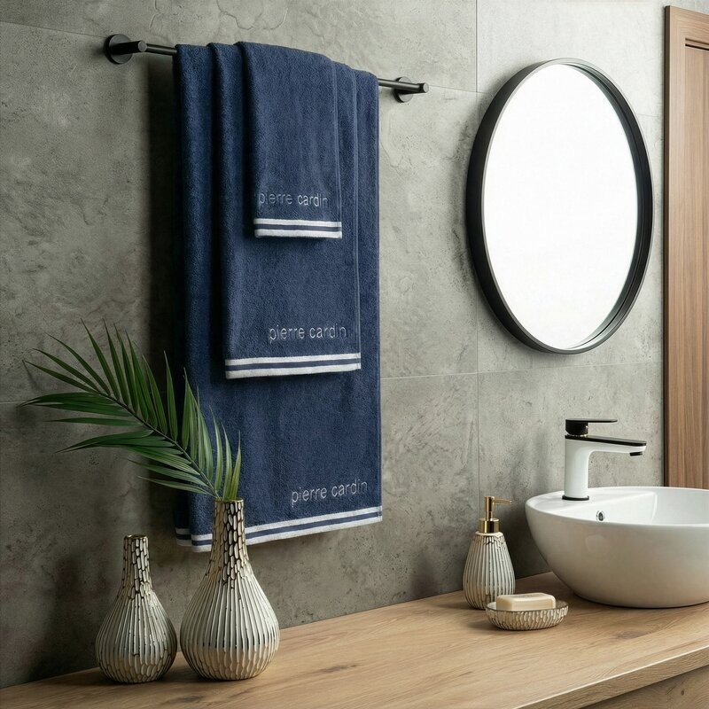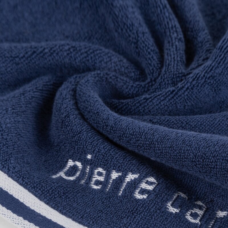 Jednokolorowy, klasyczny ręcznik kąpielowy z ekskluzywnej kolekcji Pierre Cardin zdobiony su btelną lamówką z logo projektanta. Wysokiej jakości tkanina. szerokość: 30 cm, długość: 50 cm, kolor: granatowy, Gramatura: 430 GSM, Skład: 100% bawełna...