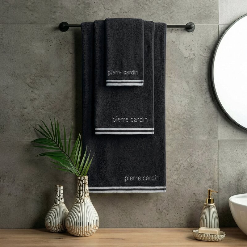 Ręcznik z kolekcji pierre cardin szerokość: 50 cm, długość: 90 cm, kolor: czarny, Gramatura: 450 GSM, Skład: 100% bawełna; cześć ozdobna: 64% bawełna, 36% poliester