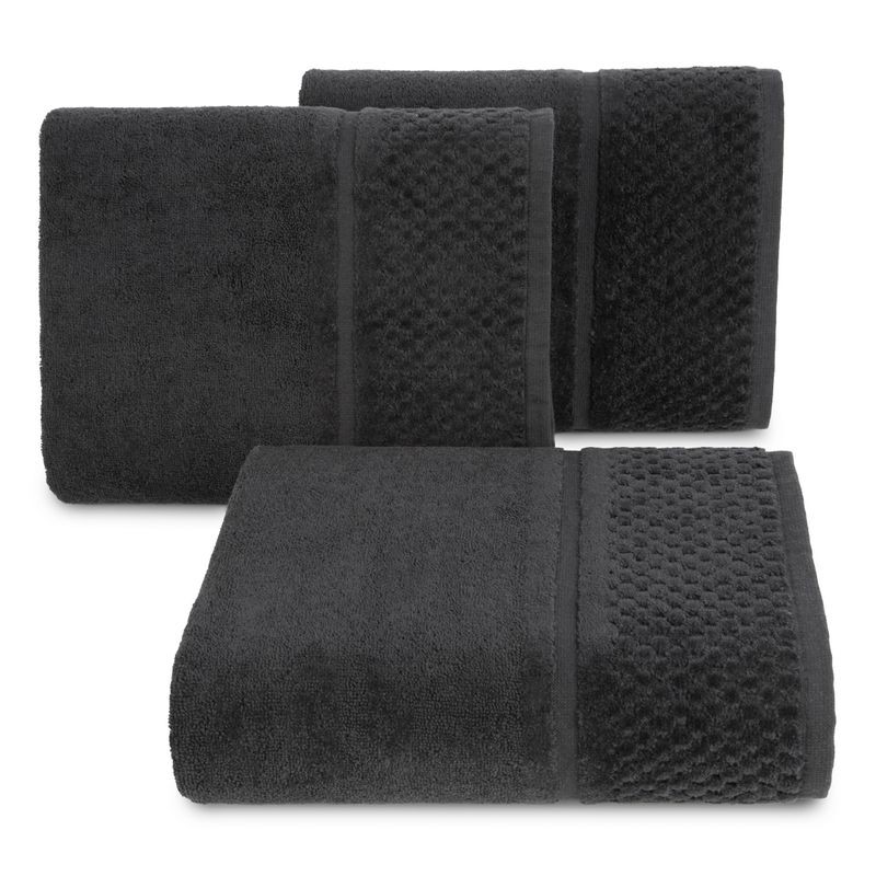 Elegancki ręcznik z delikatnej i bardzo chłonnej tkaniny frotte, jednokolorowy. Krawędzie zdobione subtelną bordiurą z welwetu. Łatwy w praniu, trwałe kolory. szerokość: 70 cm, długość: 140 cm, kolor: czarny, Gramatura: 500 GSM, Skład: 100%...