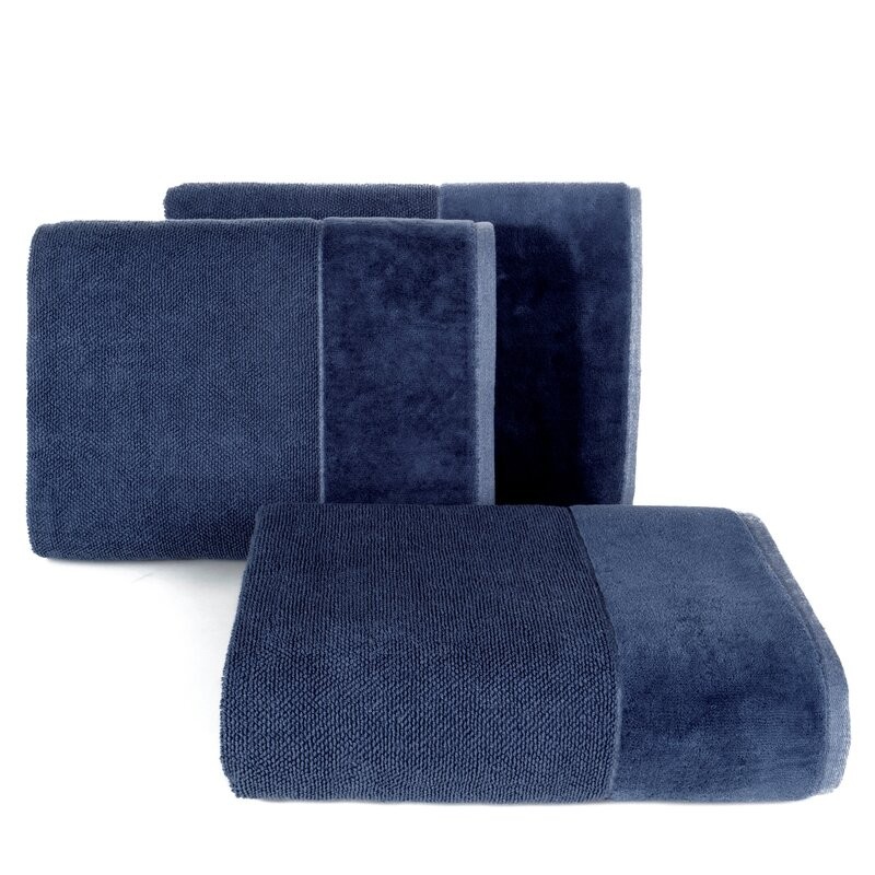 Elegancki ręcznik z delikatnej i bardzo chłonnej tkaniny frotte, jednokolorowy. Krawędzie zdobione subtelną bordiurą z welwetu. Łatwy w praniu, trwałe kolory. szerokość: 50 cm, długość: 90 cm, kolor: granatowy, Gramatura: 500 GSM, Skład: 100%...