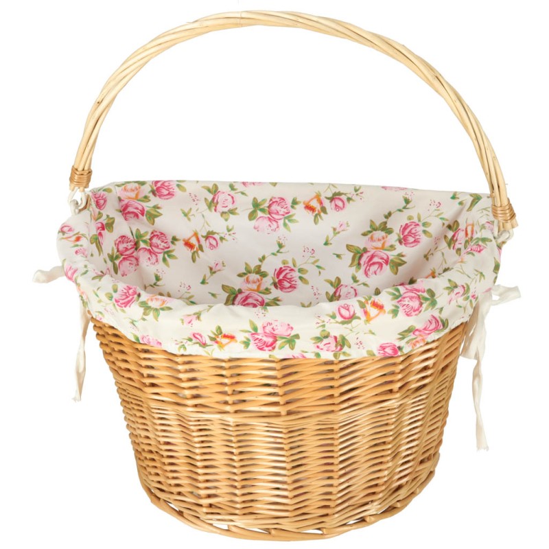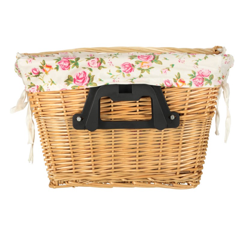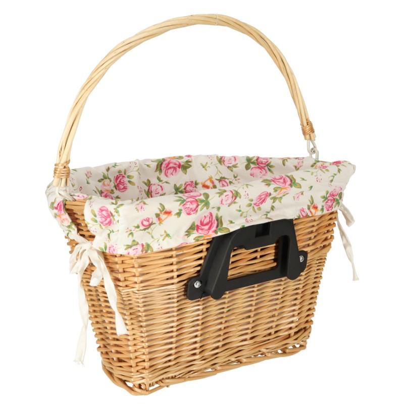 Wiklinowy kosz rowerowy z materiałowym wkładem w kwiaty. Posiada rączkę do łatwego przenoszenia. Mocowanie typu "click" ułatwia odpinanie i przypinanie koszyka. W zestawie elementy do montażu. Tworzywo: wiklina, poliester. Wymiary: 36 x 25 x 23 cm.