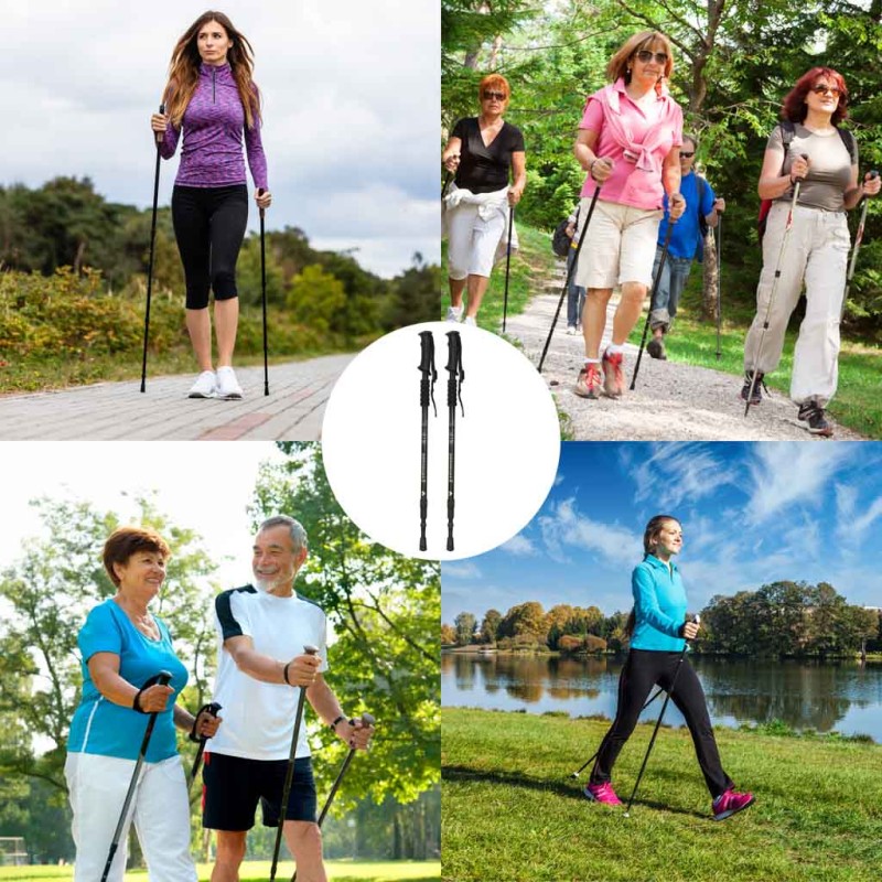 Kijki Nordic Walking aluminiowe, składane (65–135 cm), lekkie 320 g, z ergonomiczną rączką i paskiem. Końcówki z węglika wolframu zapewniają przyczepność. W zestawie 2 kijki, 2 końcówki stabilizujące (do piasku, żwiru).