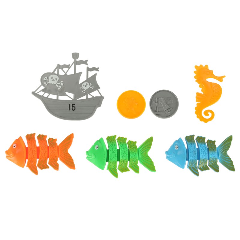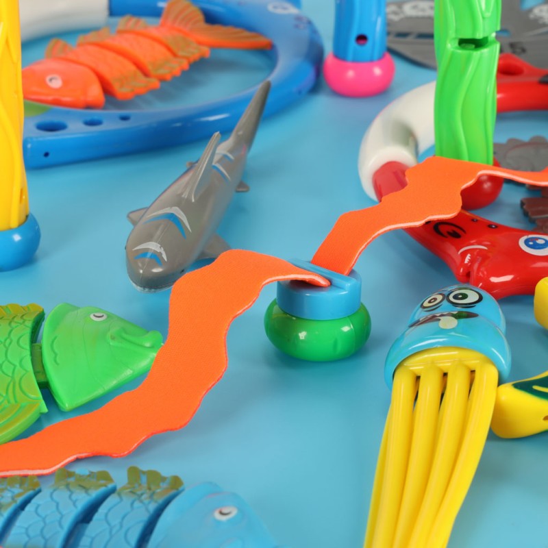 Umieszczone w basenie rybki, koniki morskie i ośmiornice są elementem zabawy, w której dziecko może rozwinąć zręczność i motorykę. Komplet zawiera rurki do nurkowania, które pomogą dziecku wyłowić zabawki z wody.