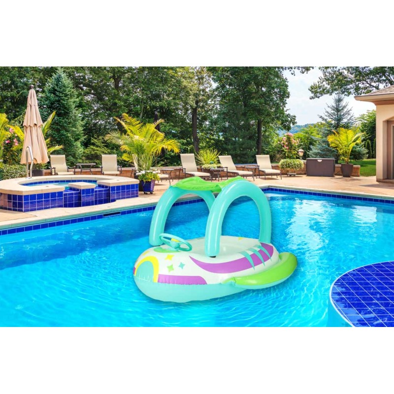 Unikalny kształt kosmicznego statku przyciągnie uwagę każdego dziecka i sprawi, że poczuje się jak prawdziwy odkrywca kosmosu. Ponton jest stabilny i bezpieczny, a dmuchane dno zapewnia komfortowe miejsce do odpoczynku i zabawy. Dodatkowym atutem jest daszek, który chroni delikatną skórę dziecka przed promieniami słonecznymi.