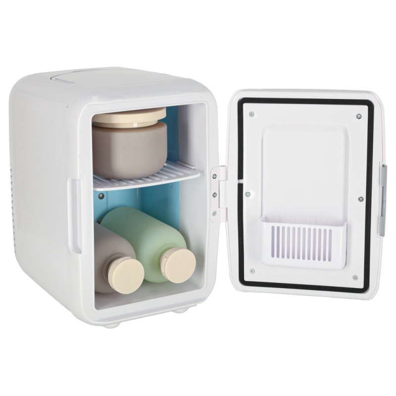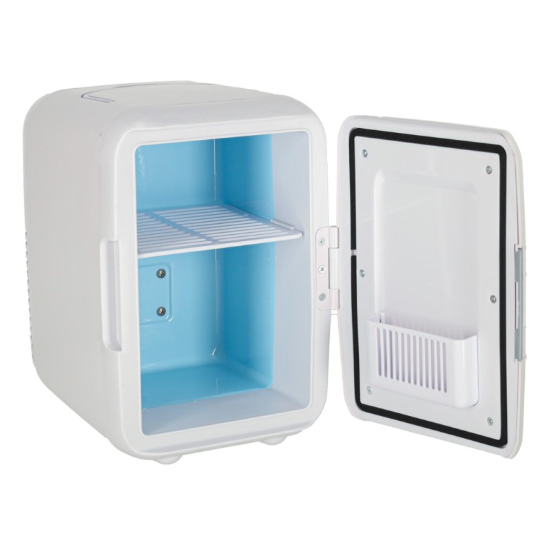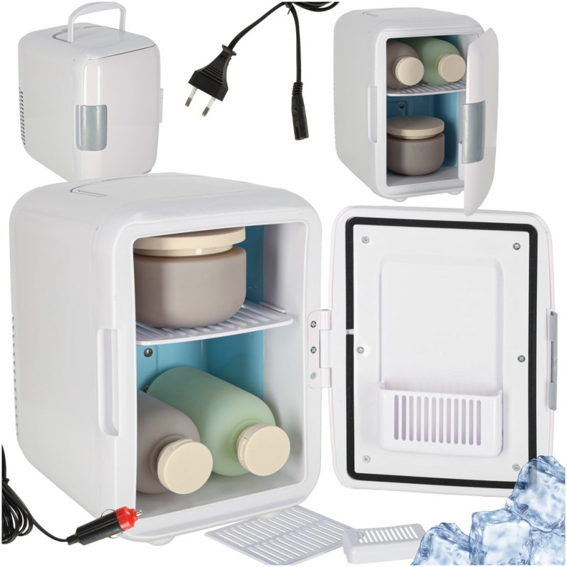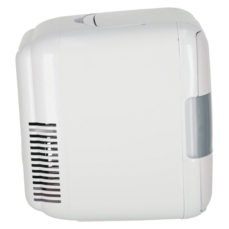 Biała lodówka turystyczna na żywność i kosmetyki o pojemności 4 l. Ma wygodny uchwyt do przenoszenia oraz funkcję grzania i chłodzenia. Do użytku poza domem oraz w aucie. Wymiary: 25 cm x 17 cm x 24 cm