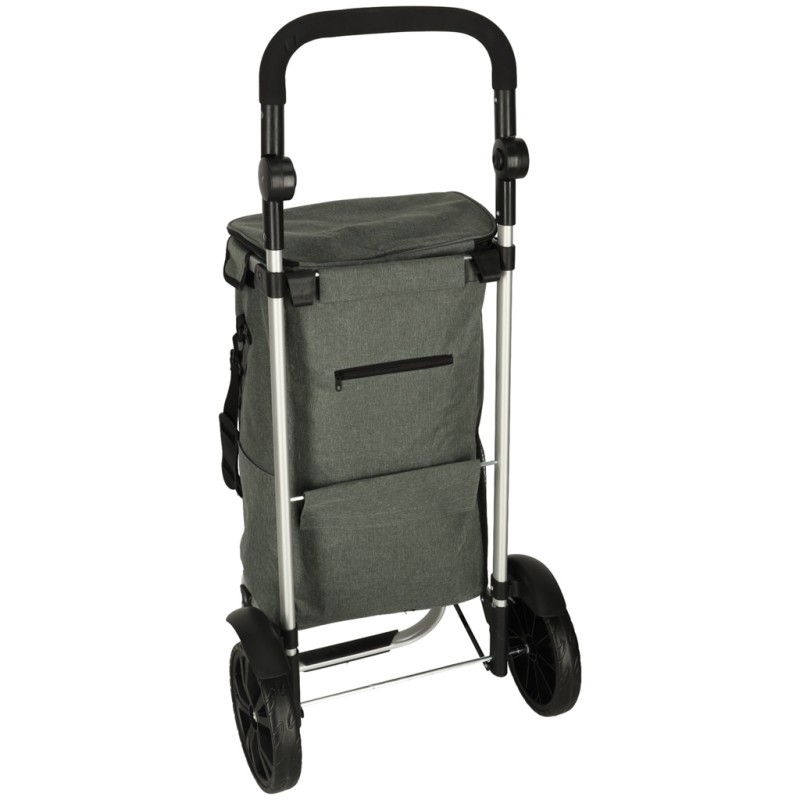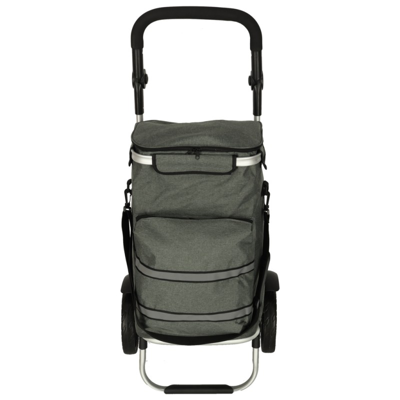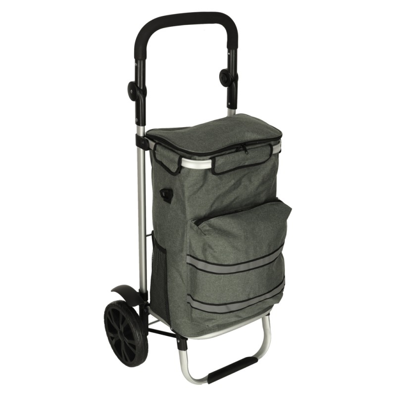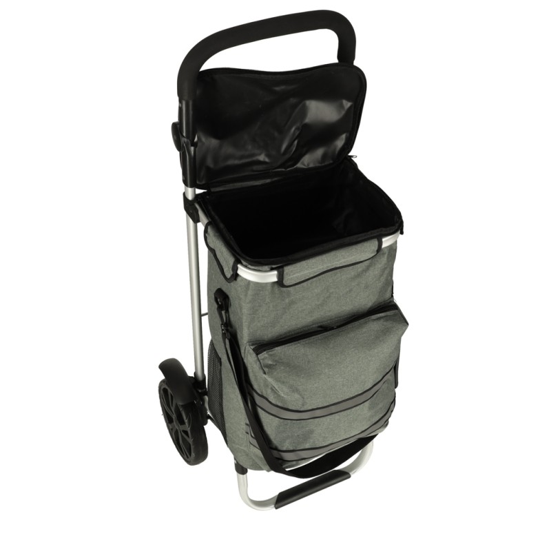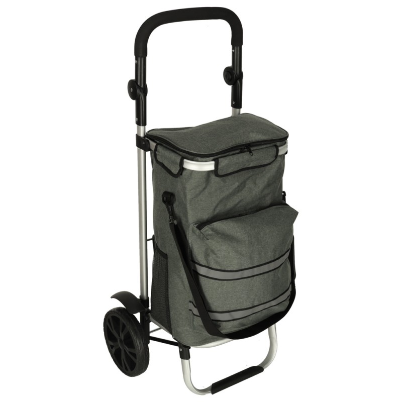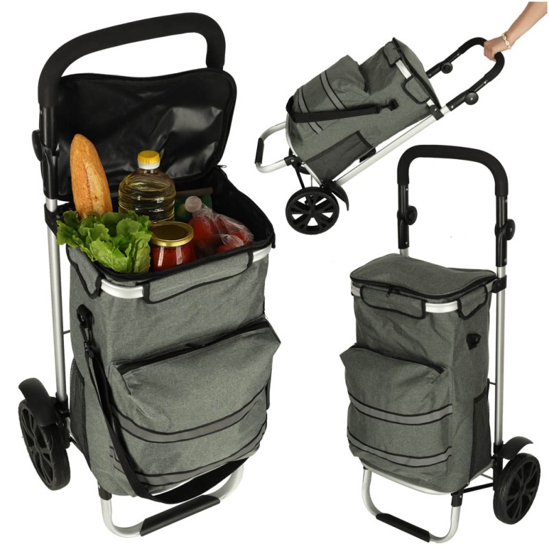 Wózek na kółkach o wysokości 100 cm z torbą o pojemności 40 litrów. Idealny do przewożenia zakupów - torba posiada termiczną kieszeń z przodu. Wymiary: 100 cm x 25 cm x 33 cm, kolor: szary