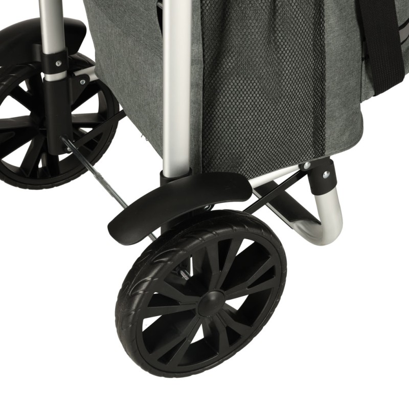 Zaletą wózka jest pojemna torba z mnóstwem kieszeni, w tym dużą termiczną kieszenią z przodu, która znajdzie zastosowanie przy transporcie produktów chłodniczych. Torba została wykonana z wytrzymałego materiału o wodoodpornych właściwościach, dlatego z pewnością przyda się przez cały rok.