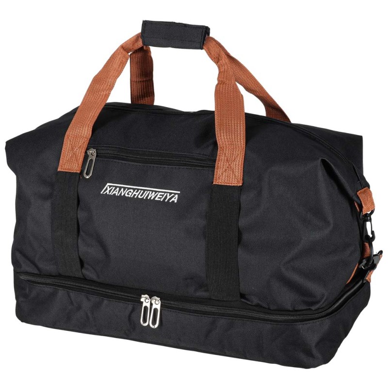 Praktyczna torba podróżna z rozpinaną dolną komorą. Odpowiednia na siłownię lub na dalekie wyjazdy. W zestawie regulowany pasek, który można przymocować na dwóch poziomach wysokości torby. Wymiary: 58 cm x 23,5 cm x 34 cm, kolor: czarny