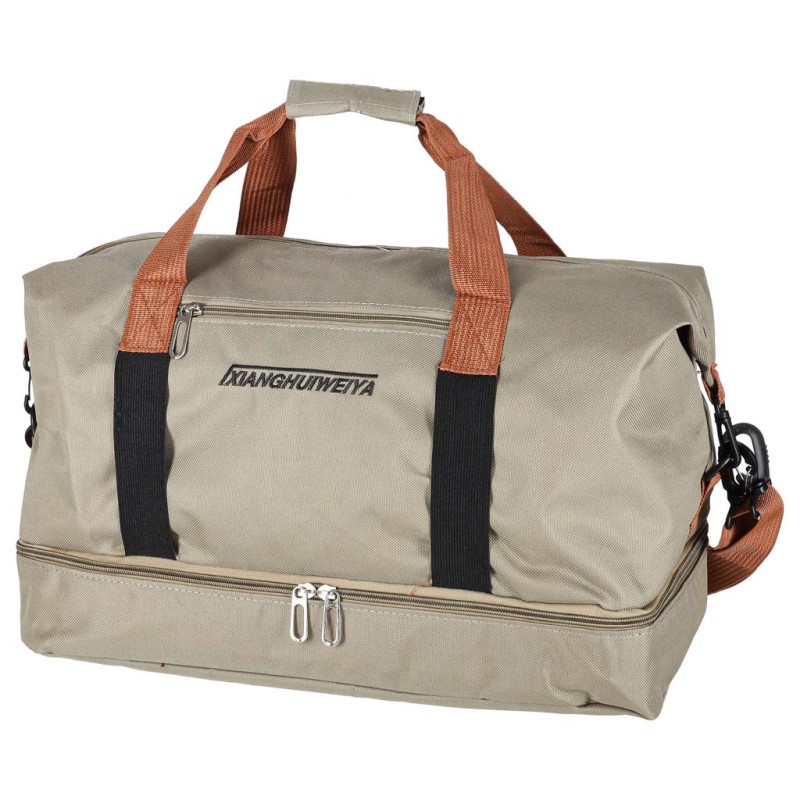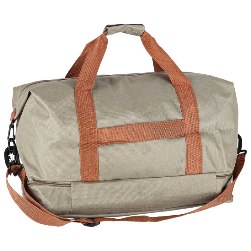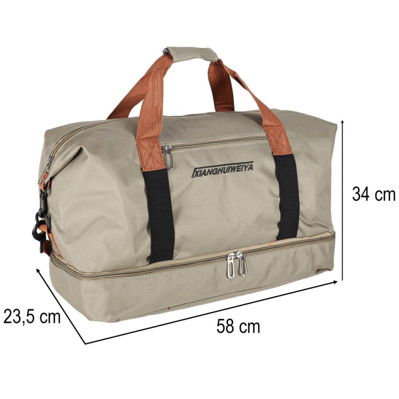 Torba podróżna z rozpinaną dolną komorą - idealna na siłownię i na urlop. Można ją potraktować jako dodatkowy bagaż podręczny do pociągu lub samolotu. Ma łączone uchwyty oraz odpinany regulowany pasek. Wymiary: 58 cm x 23,5 cm x 34 cm, kolor: beżowy