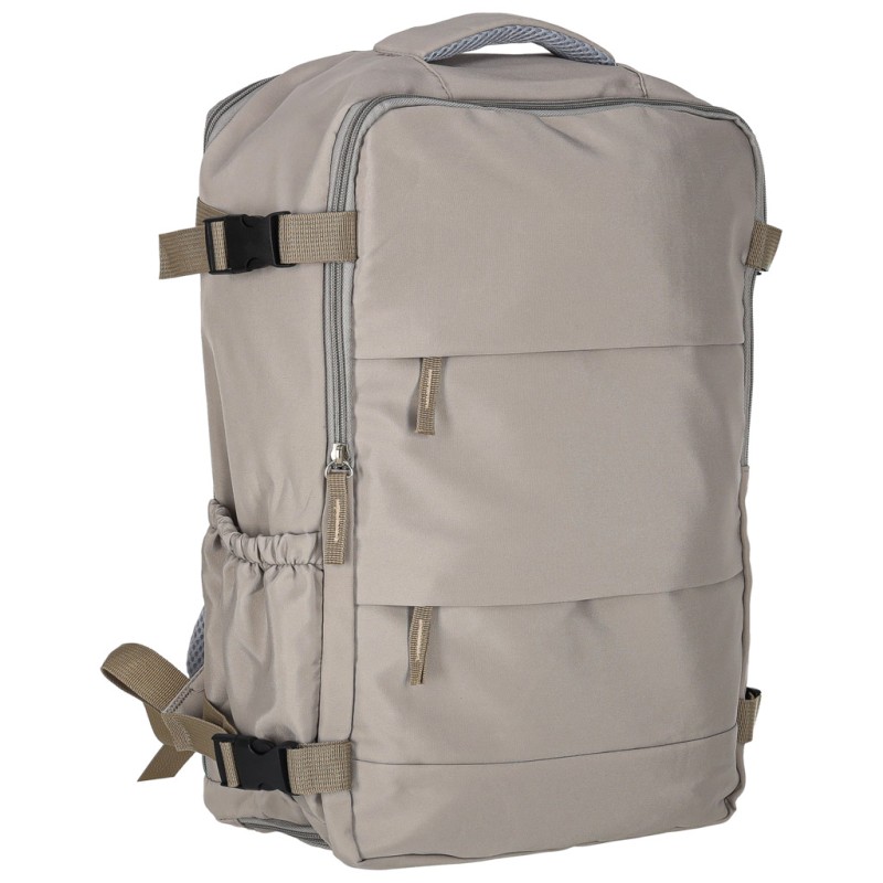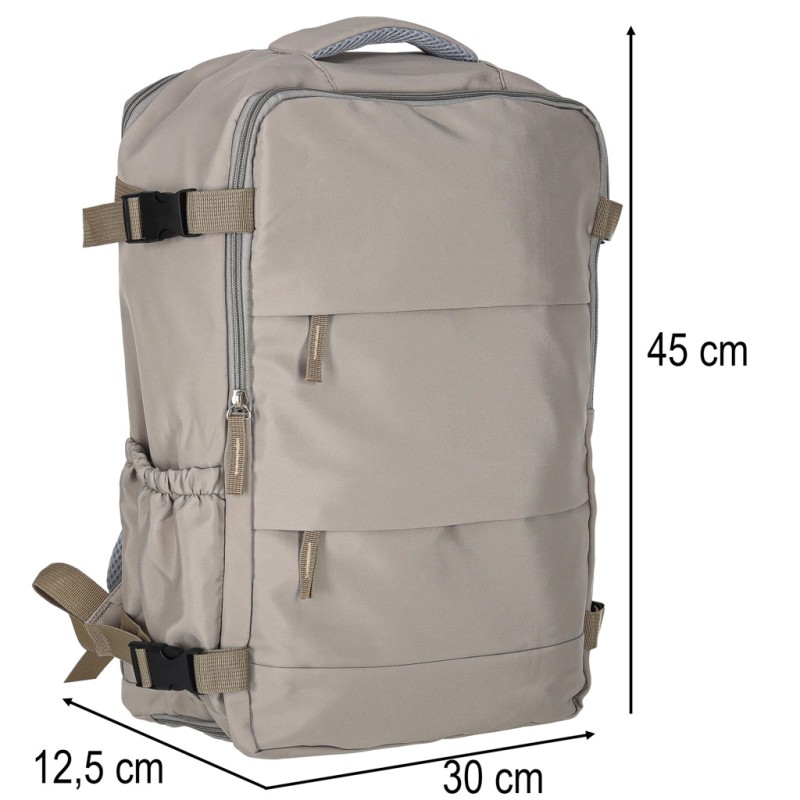 Szary plecak podróżny w idealnym rozmiarze do zabrania jako bagaż podręczny. Posiada dużą ilość kieszeni i przegród. Wyposażony w post USB ułatwiający ładowanie telefonu czy laptopa. Tworzywo: poliester. Wymiary: 45 x 16 x 28 cm.