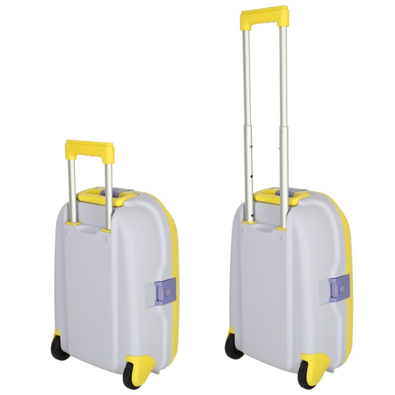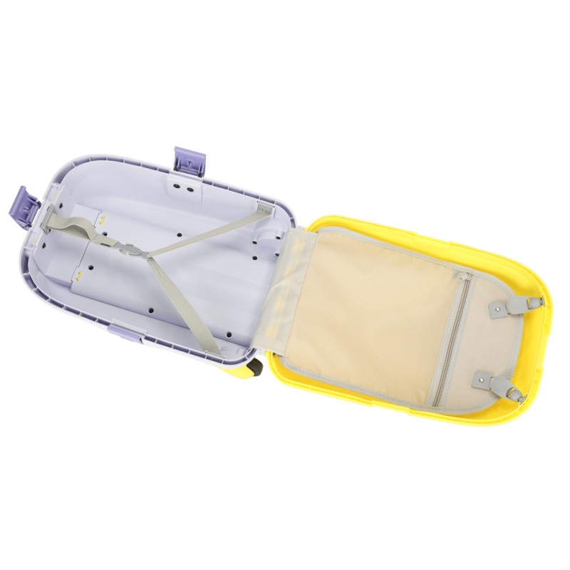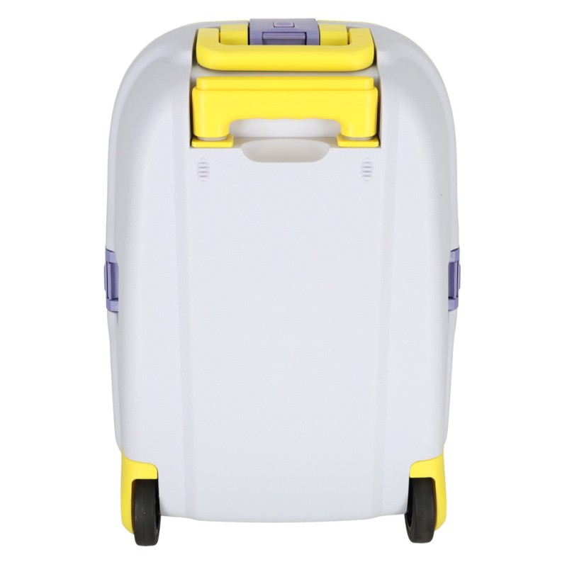 Walizka dziecięca z twardą skorupą, wyposażona w ciche kółka i wygodne rączki. Kompaktowy format kabinowy, wewnętrzne pasy zabezpieczające oraz z funkcją jeździka z paskiem, pozwalają rodzicowi bezpiecznie prowadzić dziecko podczas podróży