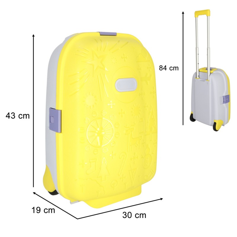 Żółta walizka dziecięca na kołkach - idealna na każdą podróż. Wyposażona w dwa kółka oraz wysuwaną rączkę. Zamykana na trzy zatrzaski. W zestawie naklejki umożlwiające podpisanie walizki. Tworzywo: plastik. Wymiary: 43 cm x 30 cm x 19 cm.