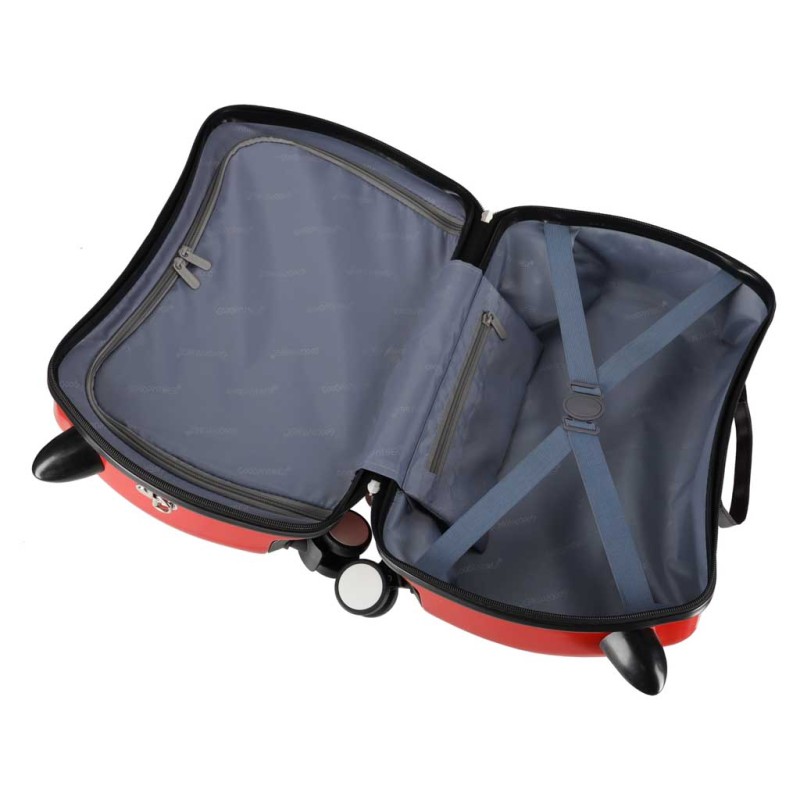 • Walizka podróżna dla dzieci z jeździkiem - dziecko jedzie wygodnie, a rodzic prowadzi ją na pasku. Idealna mała walizka podróżna na każdą podróż