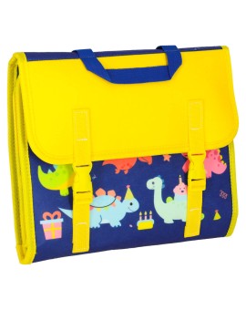 Niebieska filcowa tablica manipulacyjna z dinozaurami. Ma kształt plecaka-walizki - w środku znajdują się odpinane elementy na napy, zapięcia i sznurówki oraz zegar. Wspomoże naukę liczb, kolorów oraz j. angielskiego. Wymiary: 28 cm x 25 cm x 3,5 cm