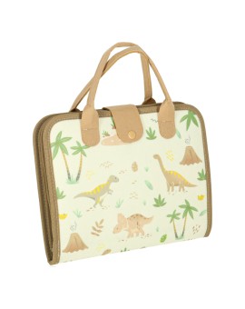 Tablica manipulacyjna Montessori w formie teczki (filc, 28×22×3,5 cm, po rozłożeniu 45 cm), z elementami motorycznymi (zamki, guziki, klamry), edukacyjnymi (litery, cyfry, dinozaury) i kreatywnymi (tablica suchościeralna, 4 markery). Dla dzieci 3+.