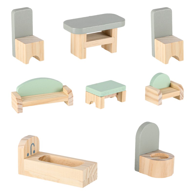 Mebelki – wanna, toaleta, lampa, sofa, fotel, stół, 2x krzesła, łóżko i otwierana szafka z półeczkami