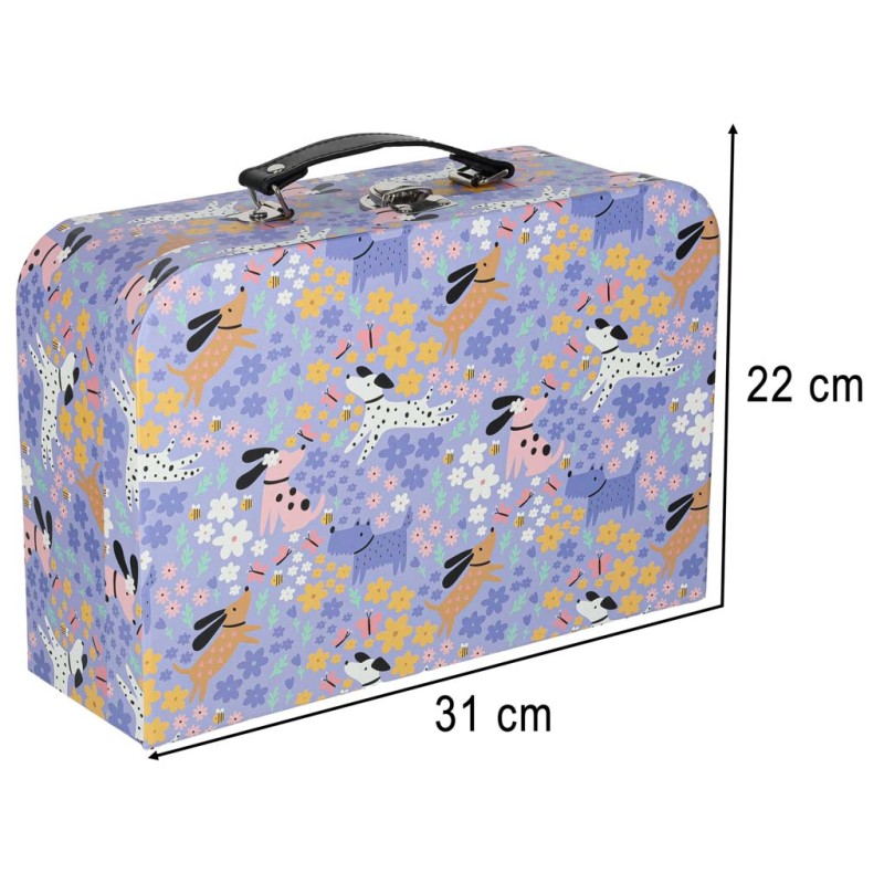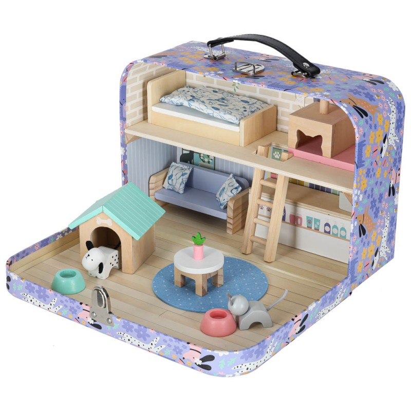 Przenośny domek w walizce z drewnianymi mebelkami i figurkami zwierząt. Ugość pieska i kotka w uroczym hotelu dla zwierząt z budą i drapakiem. Zestaw zawiera 18 elementów, w tym łóżko z posłaniem oraz ladę z kasą. Wymiary: 31 cm x 22 cm x 10 cm