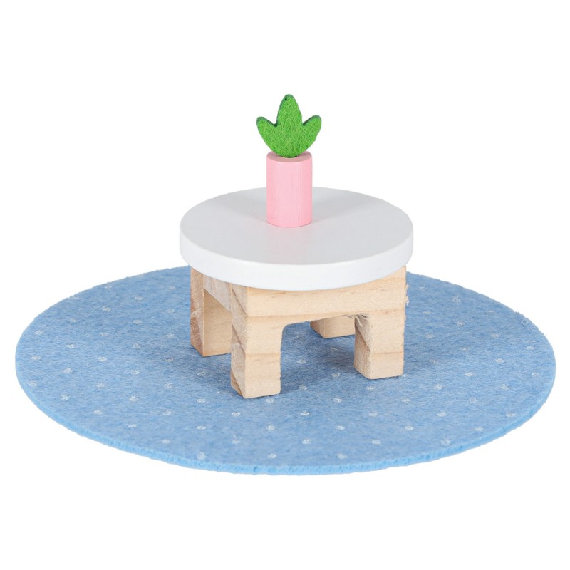 Domek dla lalek z drewnianymi mebelkami zamknięty w uroczej walizce. Zestaw 25 elementów zawiera między innymi łóżko z posłaniem, półkę i zlew z ruchomymi drzwiczkami, dywan oraz konika na biegunach. Wymiary: 31 cm x 22 cm x 10 cm