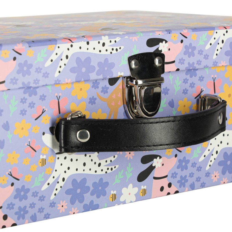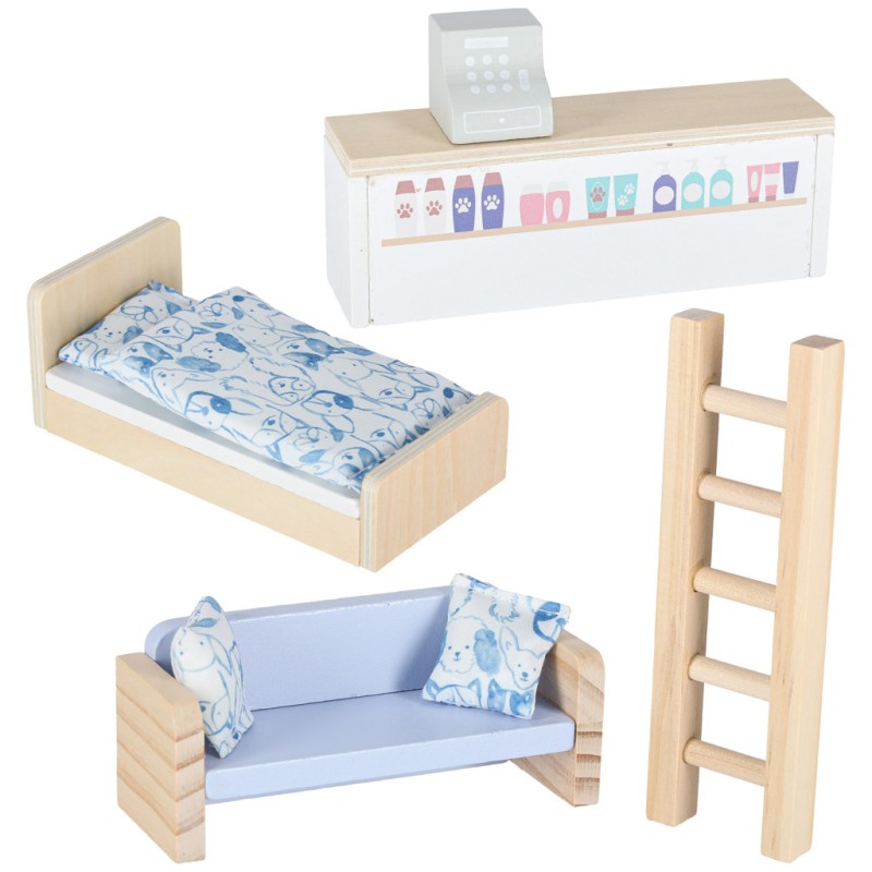 W domku mieszka pies i kot – mają swoje miski, a także legowiska w postaci budy i drapaka. Różnorodne akcesoria w zestawie dają wiele pomysłów na kreatywne zabawy. Po użyciu można schować mebelki z powrotem do walizki, co ułatwia utrzymanie porządku.