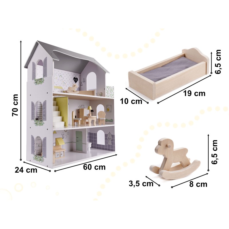 Domek dla lalek z przestronnymi wnętrzami daje wiele możliwości aranżacji oraz adaptacji. Małe mebelki są starannie wyszlifowane i pomalowane, by zapewnić komfortową i bezpieczną zabawę. Domek w minimalistycznej estetyce robi wrażenie swoim rozmiarem, a do tego gustownie się prezentuje. Sprawdzi się jako prezent okolicznościowy z okazji świąt czy urodzin.