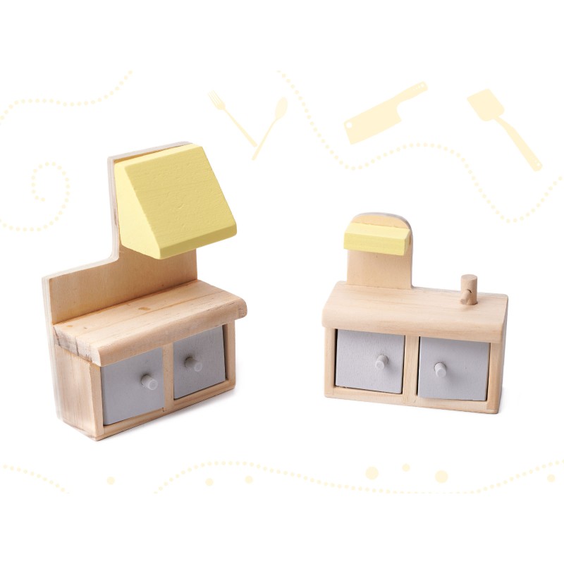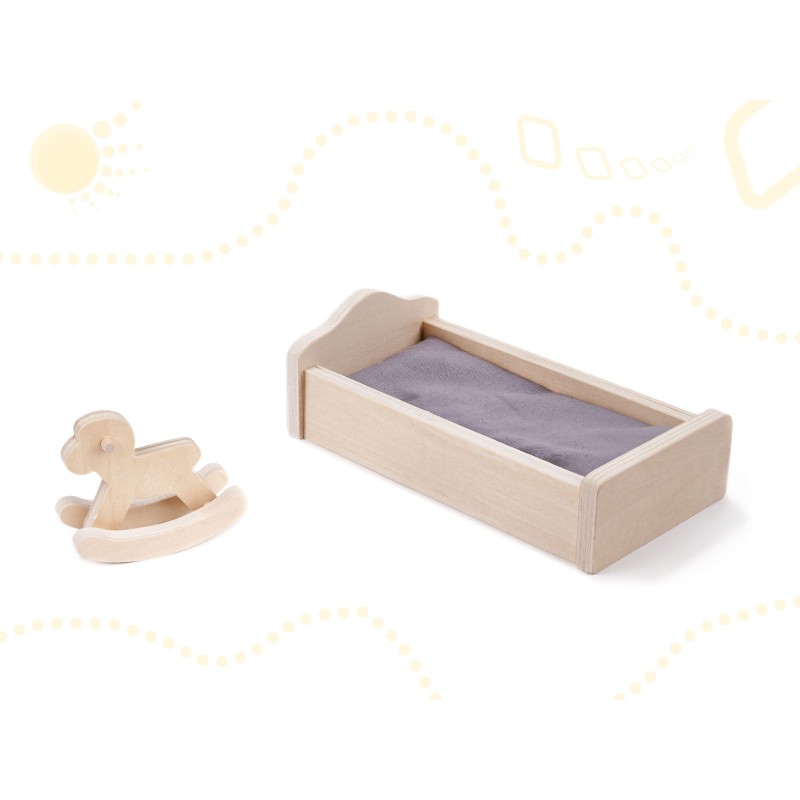 Meble (10 szt.): 2 krzesełka, stolik, lampka, łóżko, koń na biegunach, szafa, szafka ze zlewem, kuchenka, toaleta