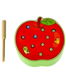 Drewniana gra magnetyczna w kształcie jabłka. Zabawa polega na wyjęciu 10 kolorowych robaczków za pomocą patyczka zakończonego magnesem. Pobudzi zmysł logicznego myślenia i zręczności. Tworzywo: drewno, plastik, metal. Wymiary: 15,5x15x6,5cm.