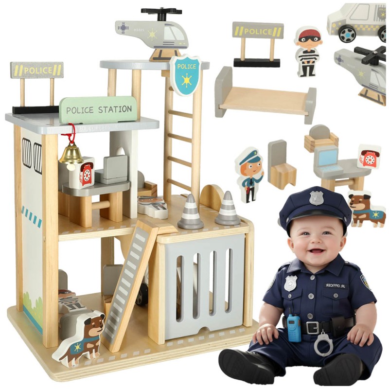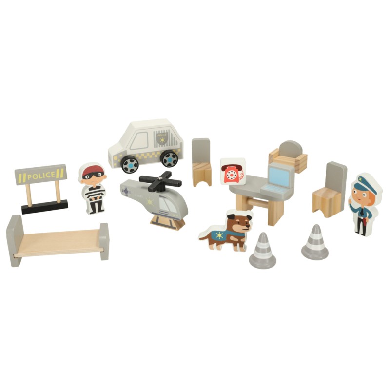 w całości wykonany z drewna – posterunek policji oraz akcesoria są wykonane z wysokiej jakości drewna, aby Twoje dziecko mogło jak najdłużej cieszyć się zabawką