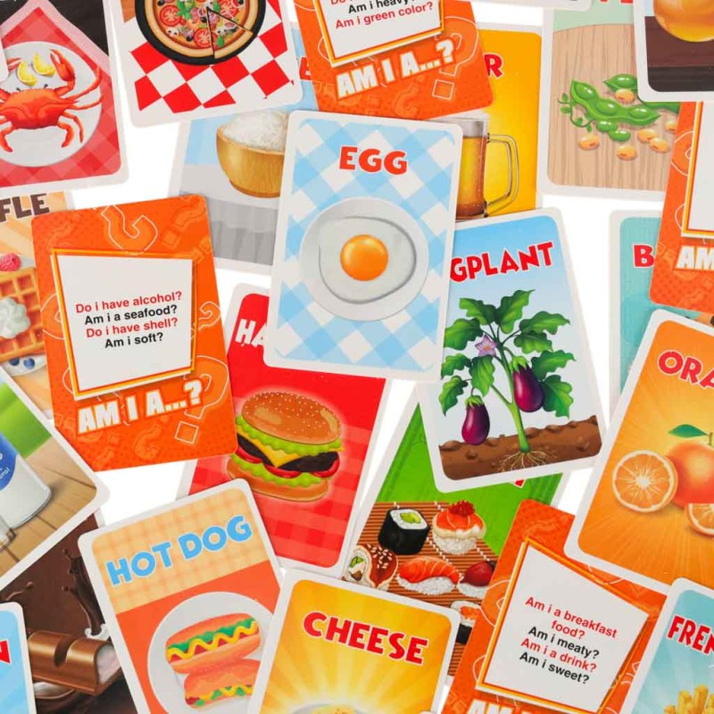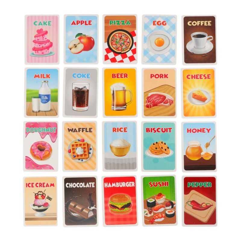 Zestaw zawiera 54 kart, które mają różnorodne obrazki jedzenia i podpisy po angielsku. Czas każdej rundy kontroluje klepsydra, co dodaje grze dynamizmu i rywalizacji. Gracze muszą szybko zadawać pytania, aby odgadnąć, co znajduje się na ich karcie, co wprowadza dodatkowy element adrenaliny do zabawy.