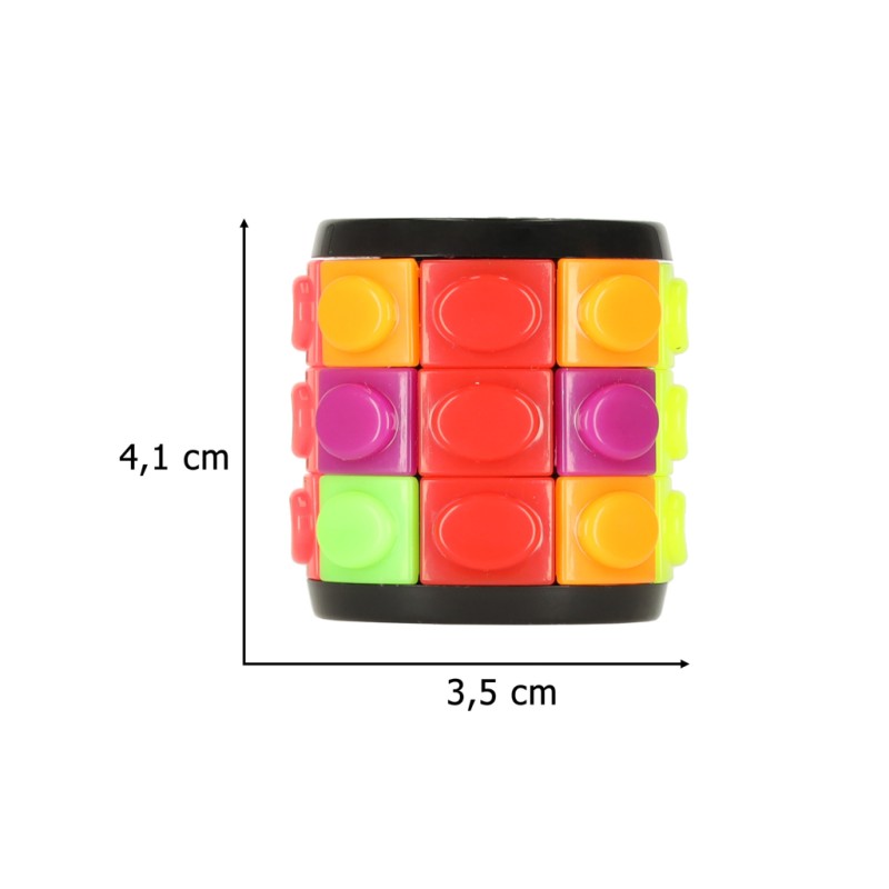 Układanka logiczna w formie walca z kolorowymi kostkami. Należy ułożyć taki sam kolor w jednej kolumnie. Łamigłówka zajmie ręce na długie godziny. Idealna podczas podróży. Uczy koncentracji i logicznego myślenia. Tworzywo:plastik. Wymiary:3,5x4,1cm.