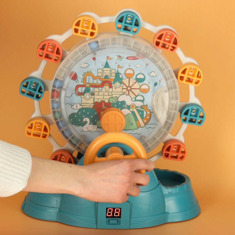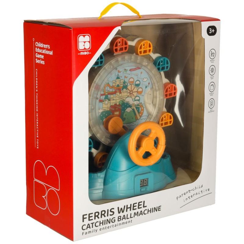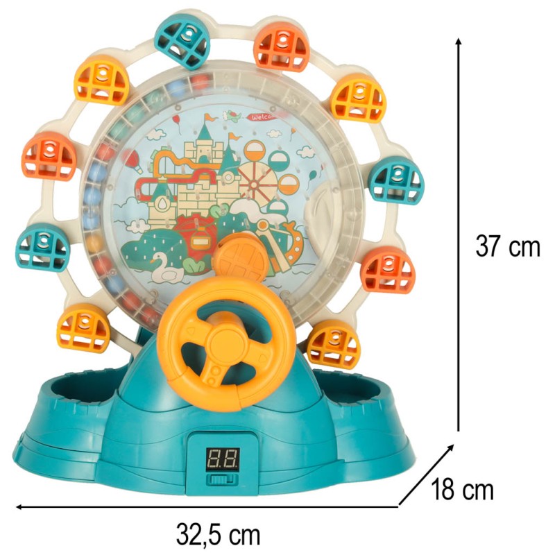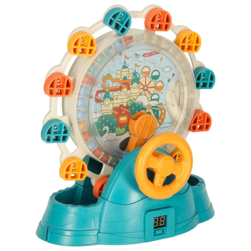 ● Kolorowy mechanizm z obracającym się diabelskim młynem, pojemnikiem na kulki, sterowaną kierownicą i rynienką do łapania kulek