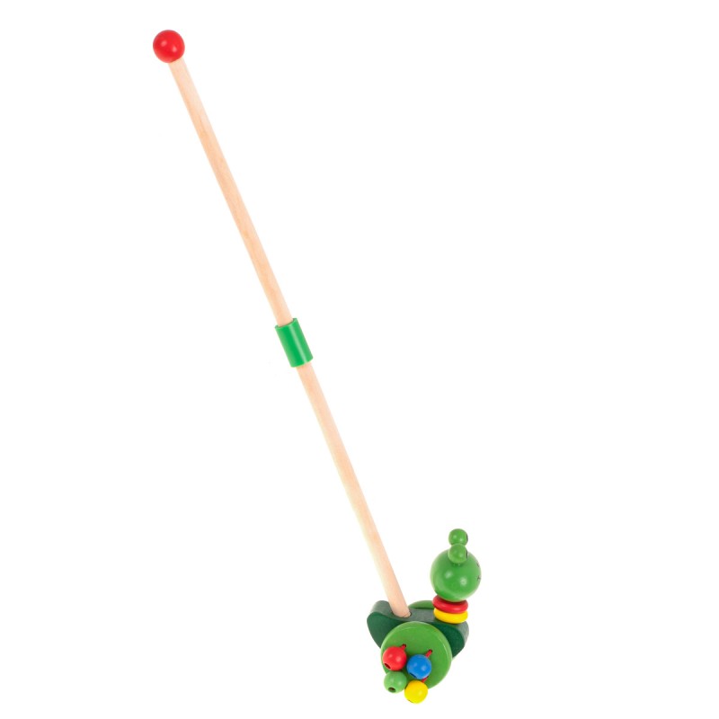 Sympatyczna żabka wykonana z drewna, którą można prowadzić przy pomocy prowadnika.
