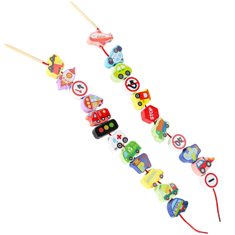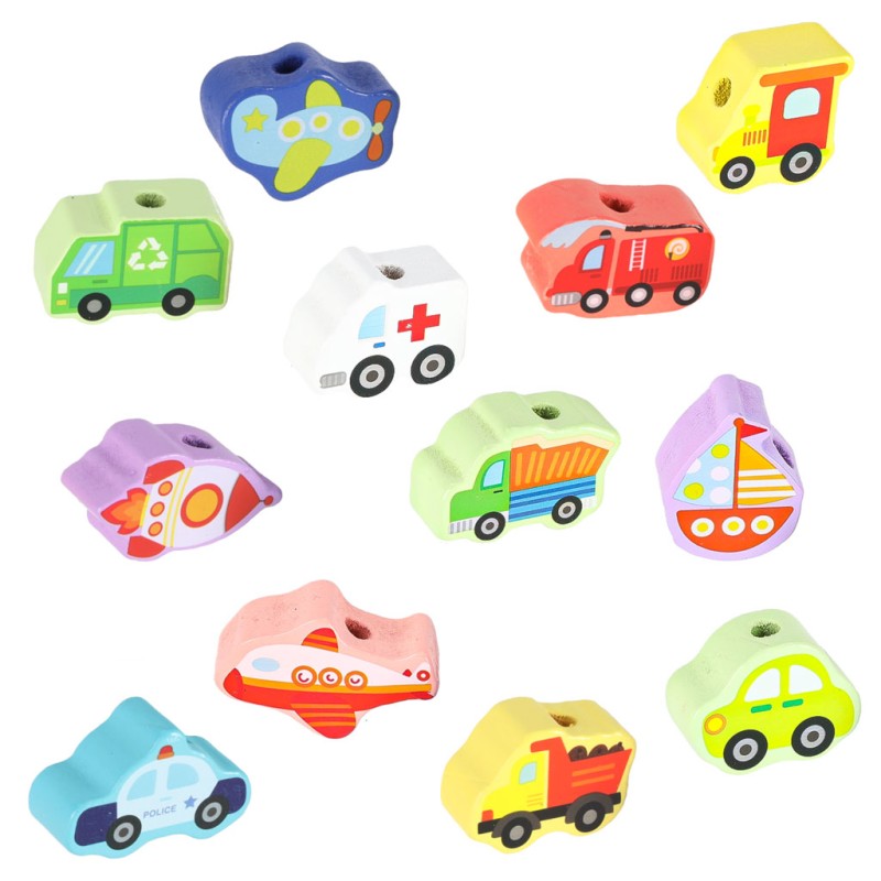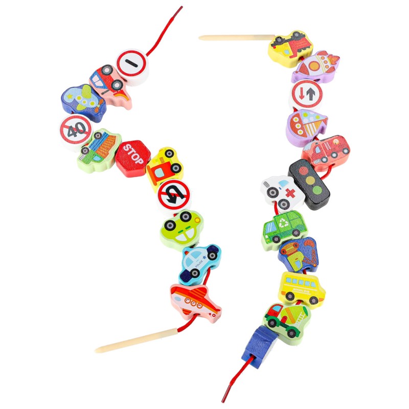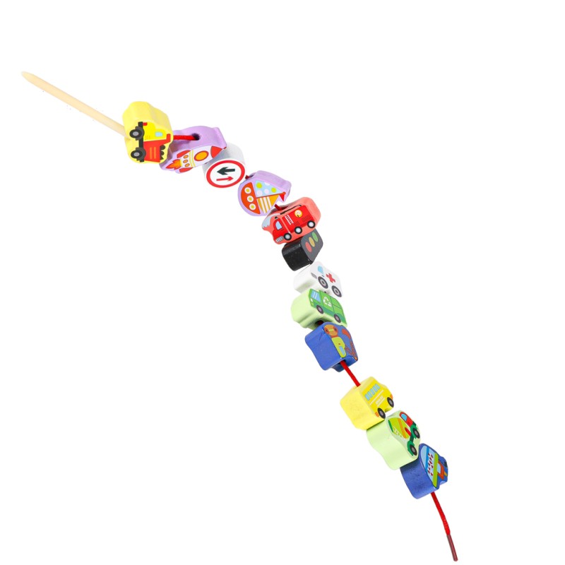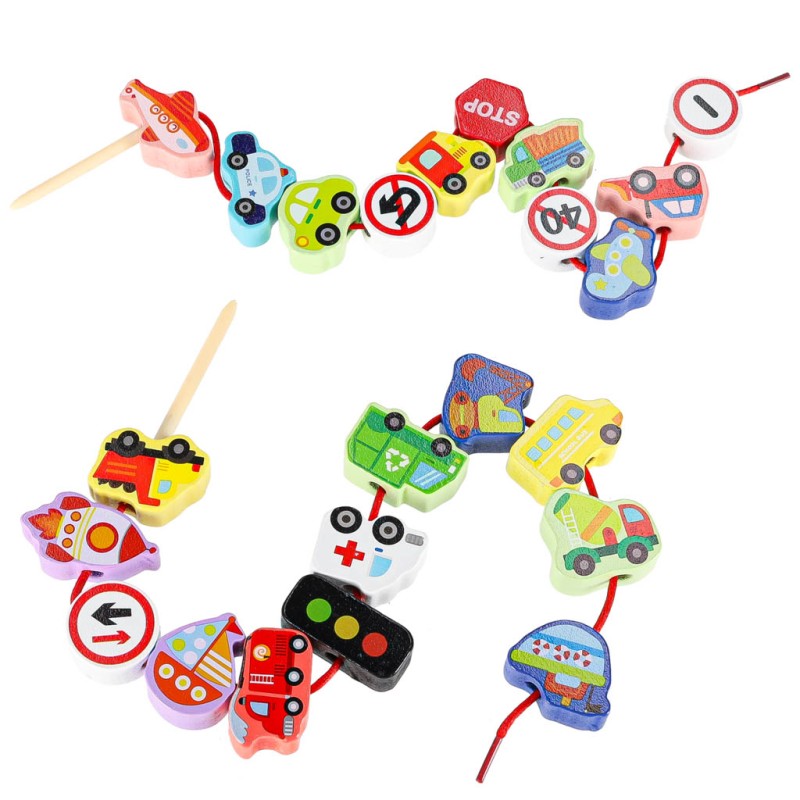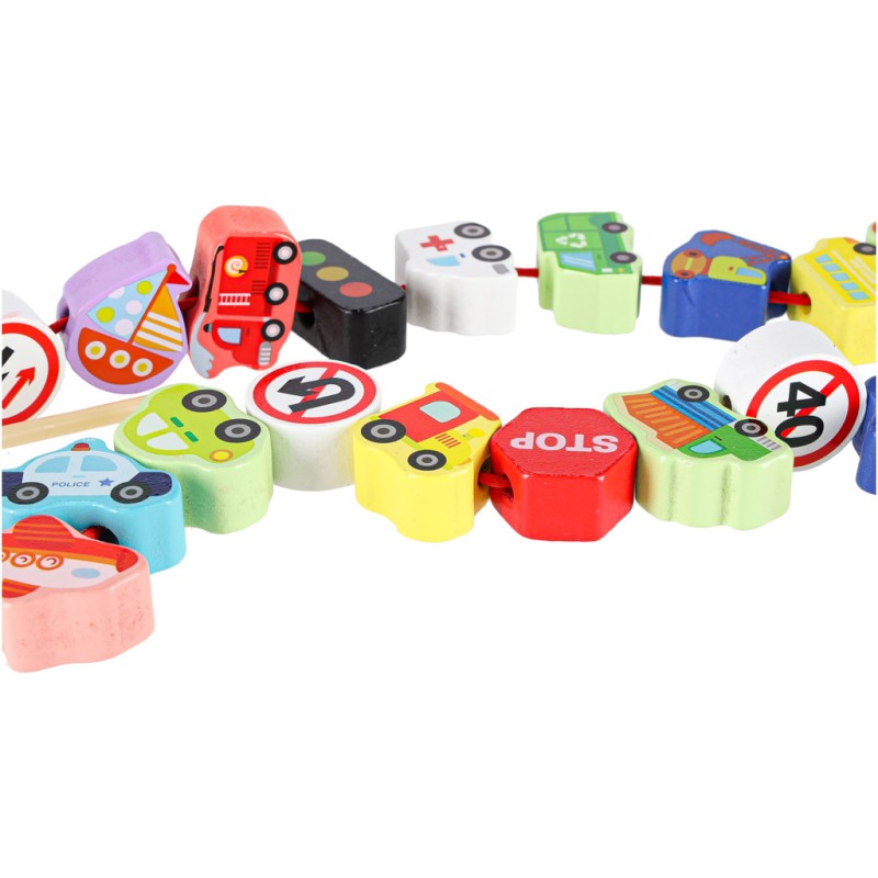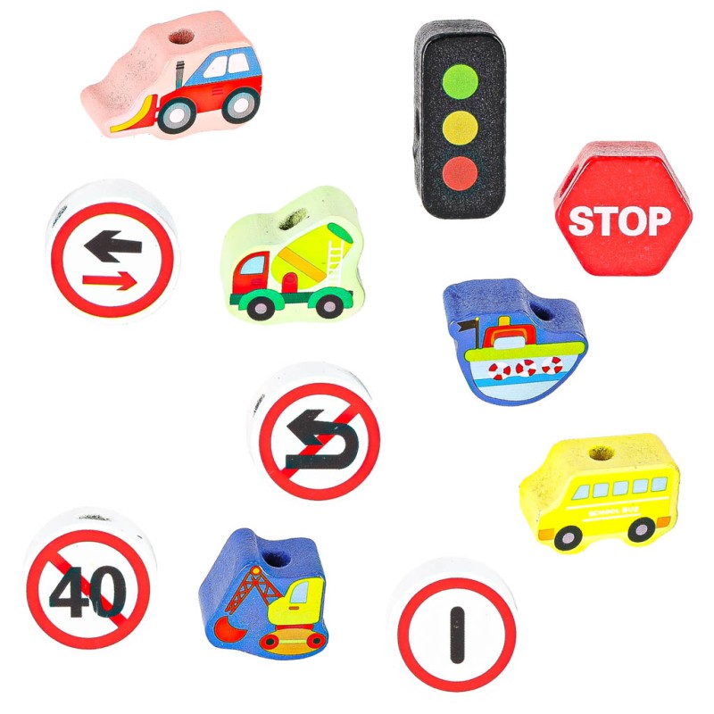 KLOCKI DREWNIANE DO NAWLEKANIA - POJAZDY ZNAKI DROGOWE + DWA SZNURKI Z NAWLEKACZAMI