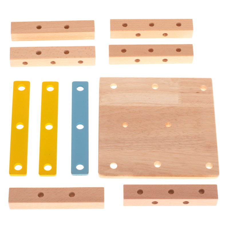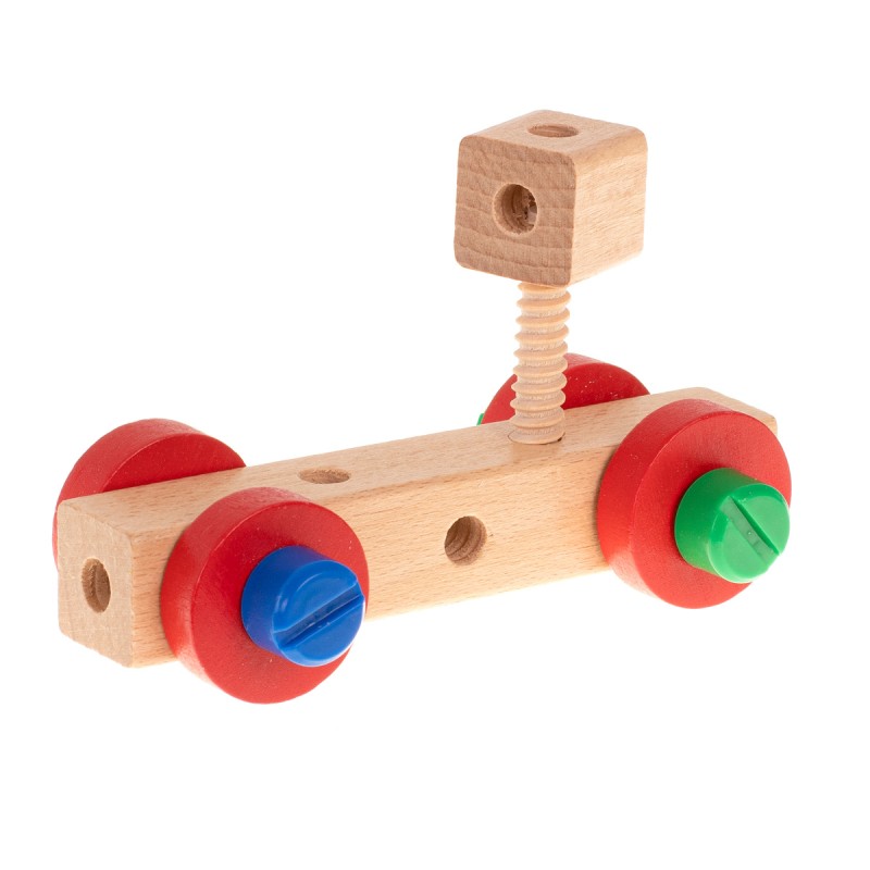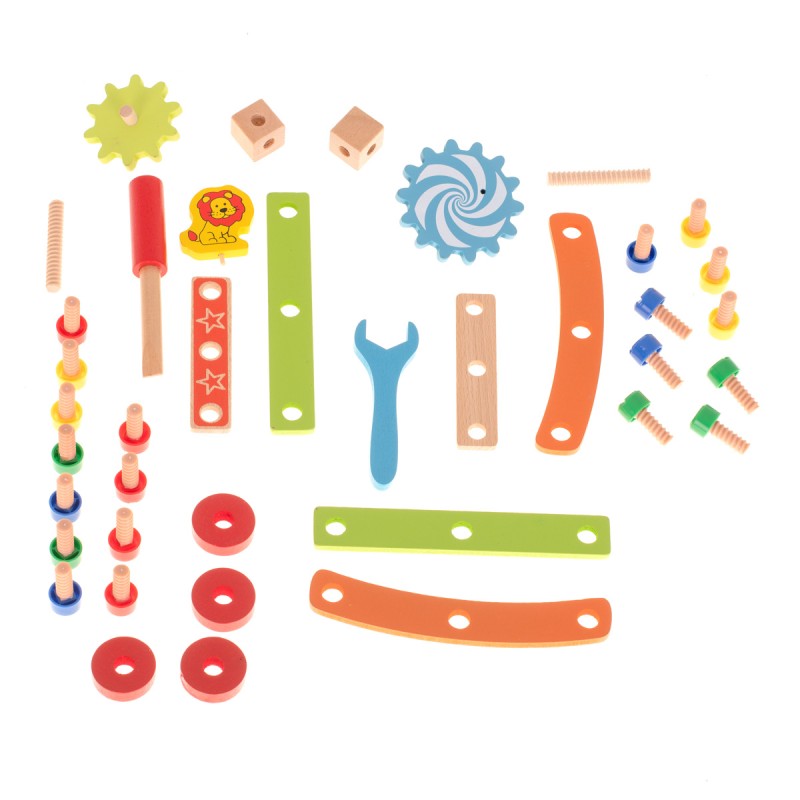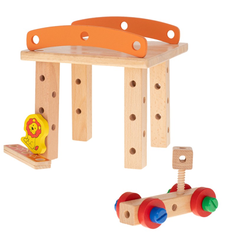 Drewniany, wieloelementowy zestaw konstrukcyjny dla majsterkowiczów. Można zbudować różne konstrukcje, a nawet krzesełko. Zestaw zawiera 49 części do złożenia i akcesoria. Tworzywo: drewno i plastik. Wymiary: wysokość – 27cm, siedzisko – 17x17cm.
