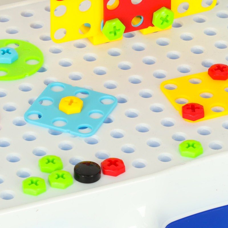 Edukacyjny zestaw w walizce z wkrętarką. Polega na wkręcaniu różnych klocków do tablicy i utworzeniu obrazu. Zabawa rozwinie kreatywność. Zestaw składa się ze 181 elementów. Zasilany bateriami 2x AA 1,5V (brak w zestawie). Wymiary: 28,5x21x9cm.