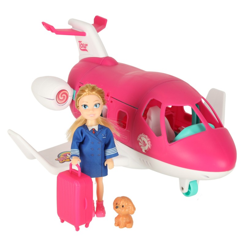 Różowy rozkładany samolot z lalką-stewardessą zabierze dziecko w świat dalekich podróży. Weź ze sobą pieska, spakuj walizkę i w drogę! Zabawa samolotem będzie pretekstem do poznawania krajów świata. Wymiary samolotu: 32 cm x 30 cm x 15 cm
