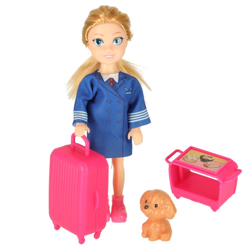 Ma lalkę-stewardessę z akcesoriami – stewardessa ma walizkę oraz pieska, ma również dostęp do wózka z przekąskami w samolocie