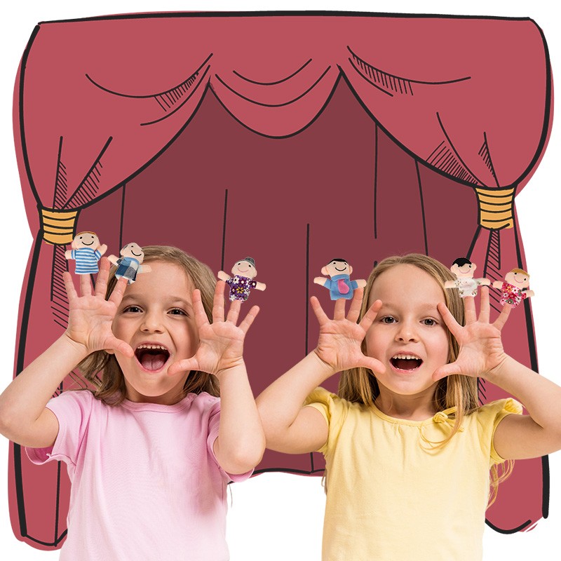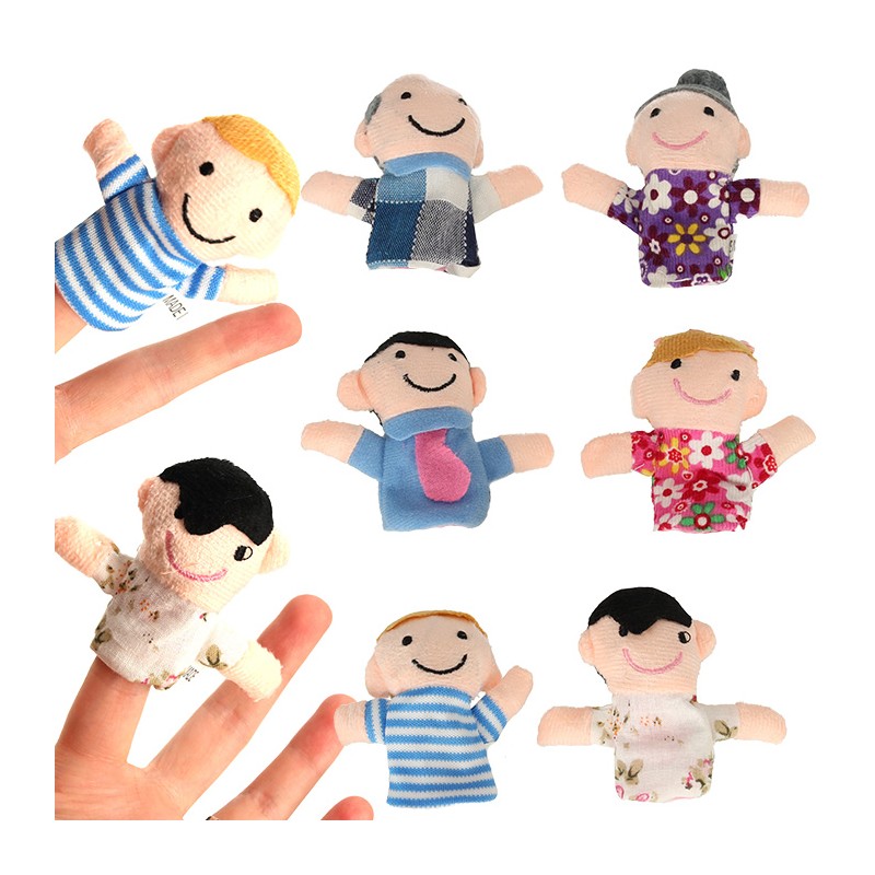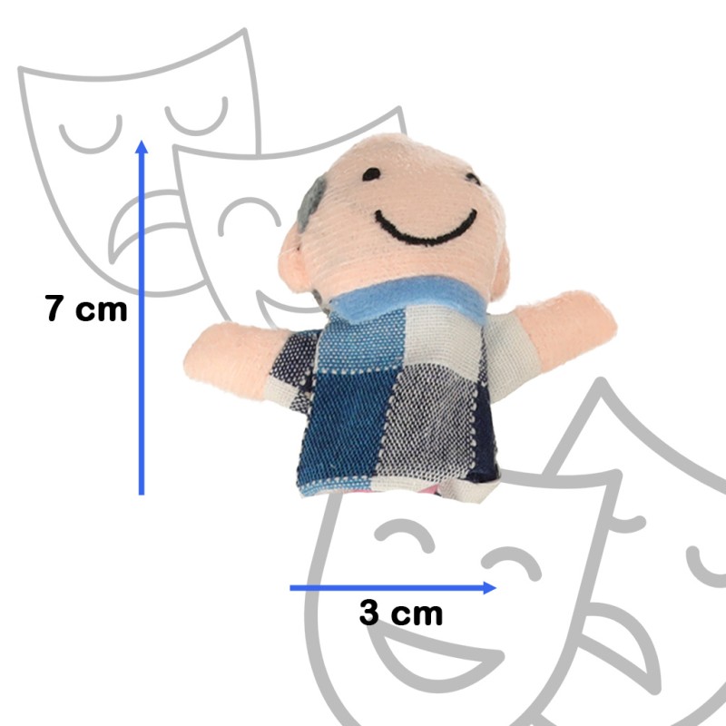 Zestaw sześciu uroczych pacynek zakładanych na palce. Każda pacynka to inny członek rodziny, wśród nich znajdą się mama, tata, córka, syn, babcia i dziadek. Idelanie nadają się do zabawy w teatrzyk. Materiał: flanela. Wymiary pacynki: 7x3cm.