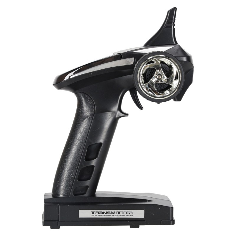 Wzmocniony plastik ABS.4 kanały; częstotliwość 2,4GHz zapewnie odporność na zakłócenia.Prędkość do 30 km/h.Zasięg do 150m.Zabezpieczenie przed przegrzaniem.Zasilanie: akumulator Li-Po 7,4V 1500mAh, 6 baterii AA.Wymiary: 46x12x12cm.