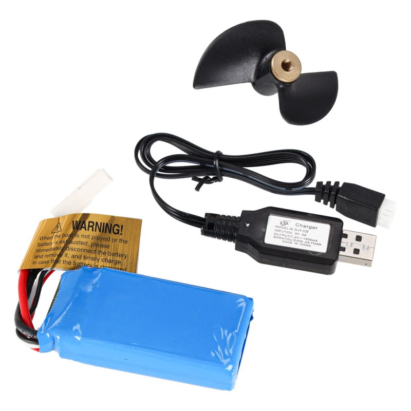 Wodoodporna łódka zdalnie sterowana. Częstotliwość: 27MHz. Zasięg do 20m. Prędkość do 20 km/h. Zasilanie: akumulator Ni-Cd 3,6V 500mAh; 2 baterie AA. Wymiary: 24x8x7,5cm.