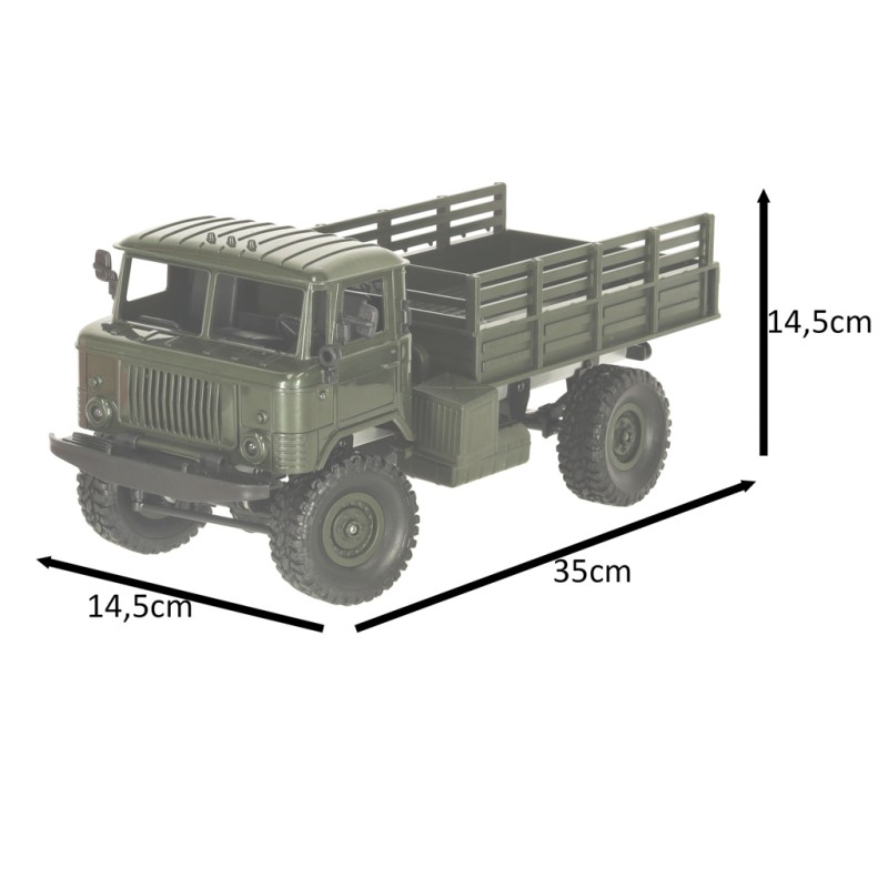 Pojazd wykonany w skali 1:16 zachwyca realizmem i dbałością o detale. Świecące światła i starannie odwzorowane elementy sprawiają, że zabawa staje się prawdziwą wojskową wyprawą. Napęd na cztery koła daje pewność, że ciężarówka poradzi sobie w każdych warunkach – pokona piasek, trawę i nierówny teren bez najmniejszego problemu. Intuicyjny kontroler zapewnia płynną jazdę i precyzyjne manewry, a długi czas pracy akumulatora gwarantuje godziny emocjonującej zabawy.