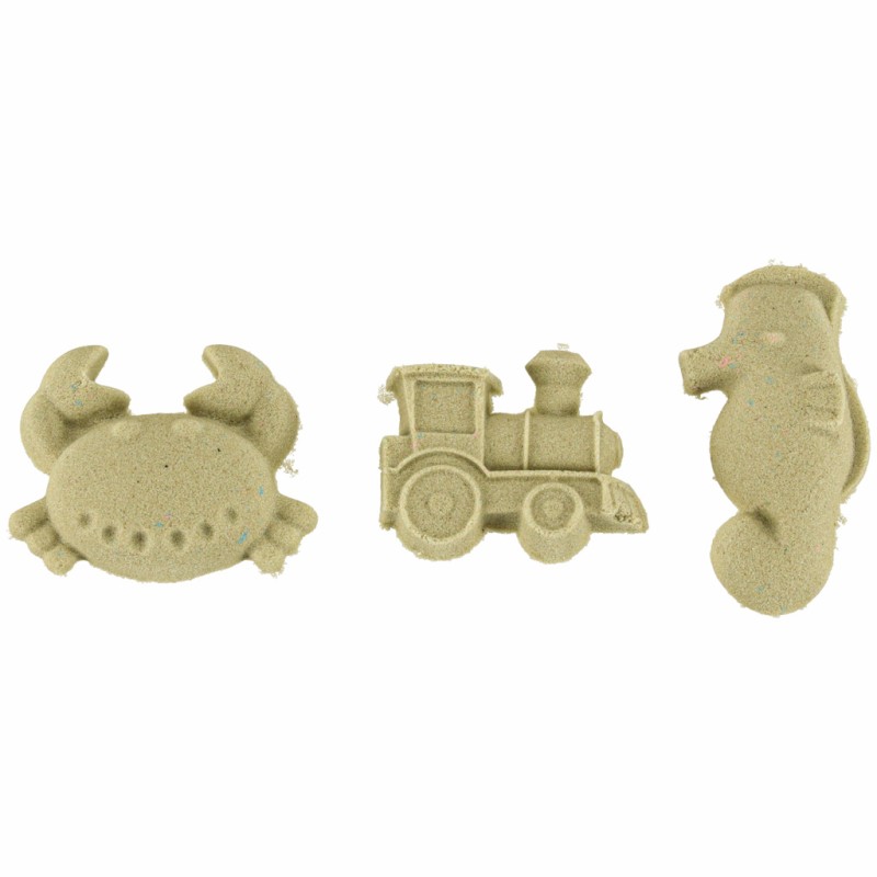 Zestaw kreatywny z piaskiem sensorycznym (750 g) o kinetycznych właściwościach. W komplecie: maszynka do cegieł, foremki do robienia babek, elementy do budowy zamku (okna, drzwi, dach). Bezpieczna zabawa dla dzieci 3+.