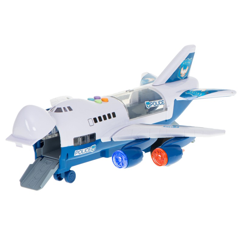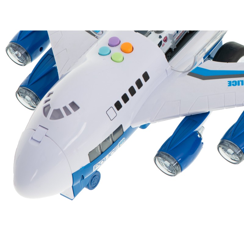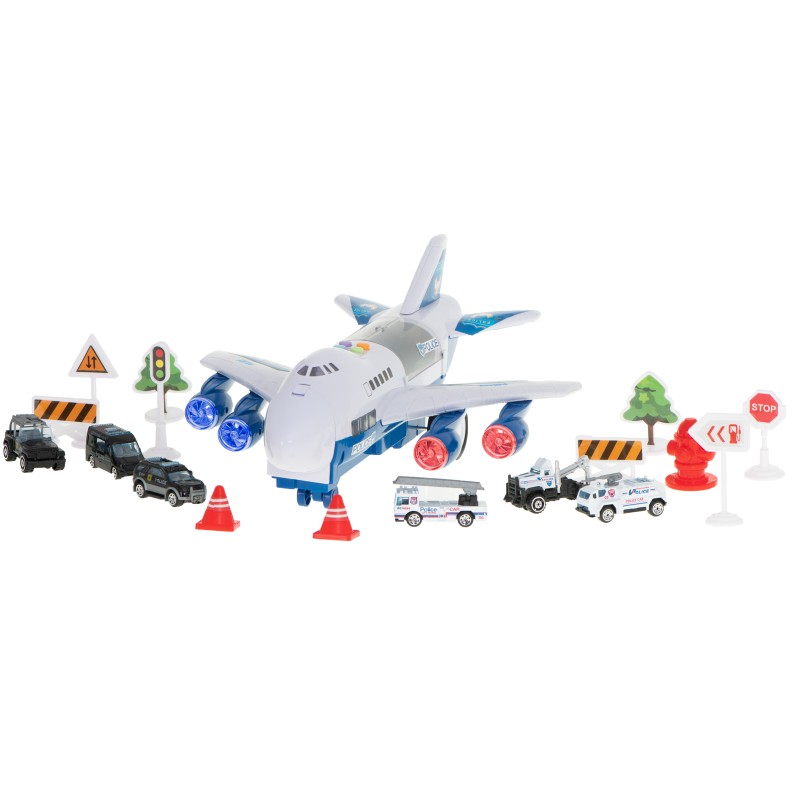 Zestaw pojazdów policyjnych w samolocie z ruchomymi elementami. Komplet zawiera transporter, ciężarówkę, auto miejskie i 7 znaków drogowych. Samolot posiada cztery sygnały dźwiękowe i diody LED. Wymiary: samolot – 30x25x14cm, auta – 7,5x2,5x2,5cm.