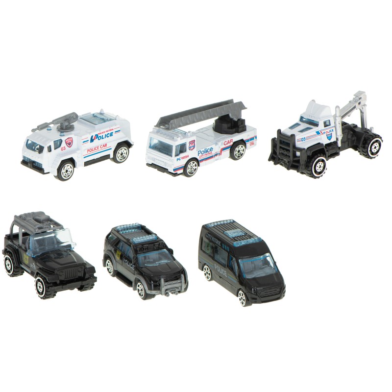 Zestaw pojazdów policyjnych w dużej ciężarówce. Komplet zawiera ciężarówkę, w której umieszczonych jest 6 różnych aut stylizowanych na prawdziwe pojazdy uczestniczące w policyjnych akcjach. Wymiary ciężarówki: 36x15x10cm, wymiary maszyn: ok. 8x4x3cm.