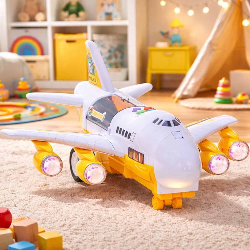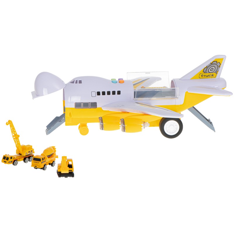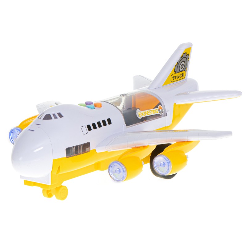 Samolot, na swoim pokładzie może przetransportować dołączone do zestawu auta. Ma on również świecące diody LED umieszczone w silnikach.