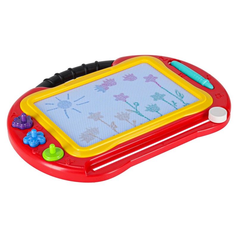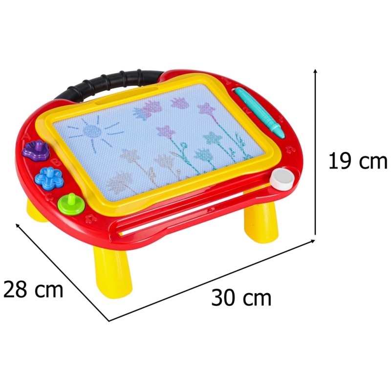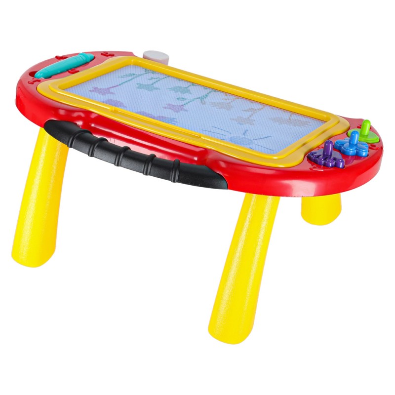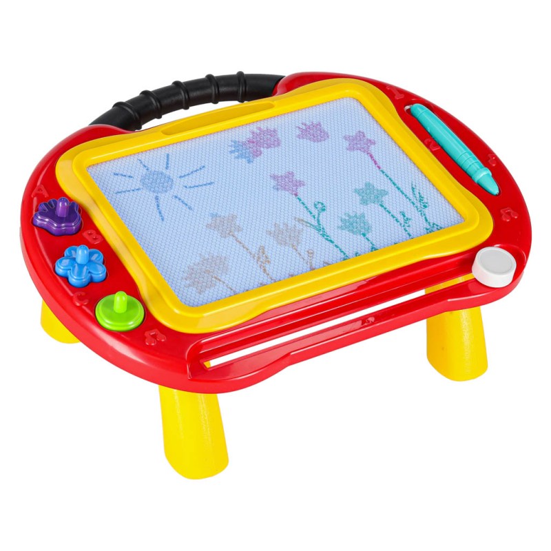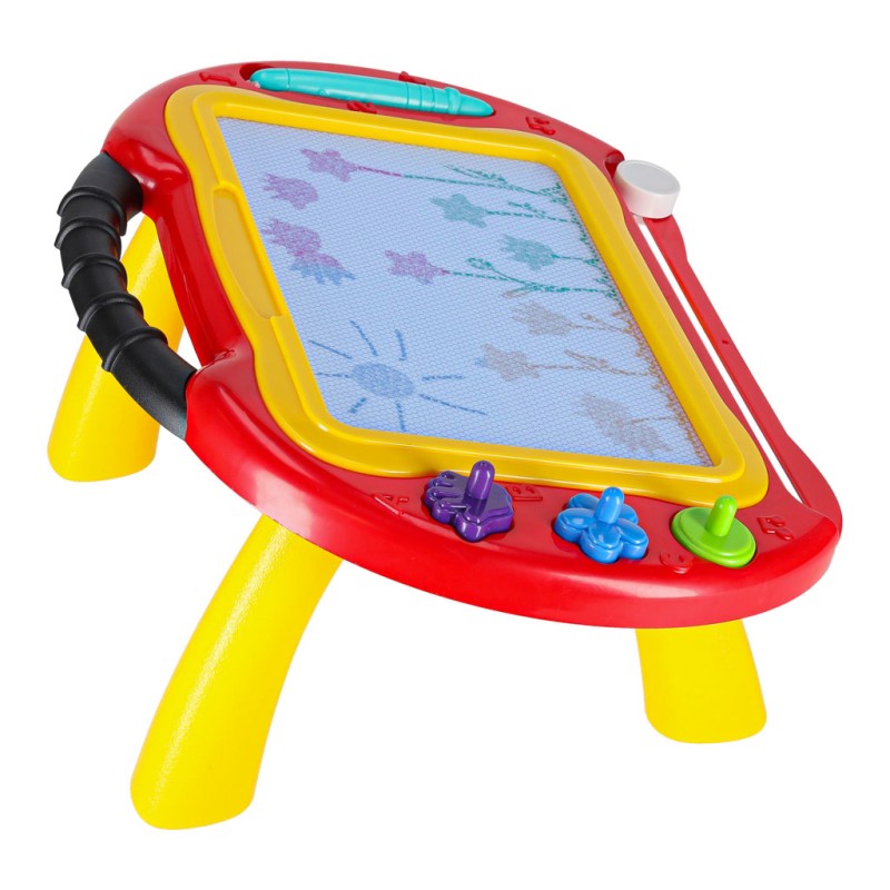 Kolorowy stolik ze znikopisem i stempelkami znakomicie się sprawdzi jako pierwsza tablica kreatywna dla malucha. Tablica do rysowania w 4 kolorach to rozwiązanie będące alternatywą dla zwykłej kartki i kredek – wystarczy przesunąć suwak, by zacząć rysować od nowa. Na tablicy można wykonywać proste rysunki lub uczyć się pisania literek i cyferek.