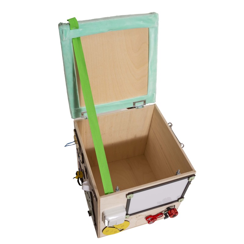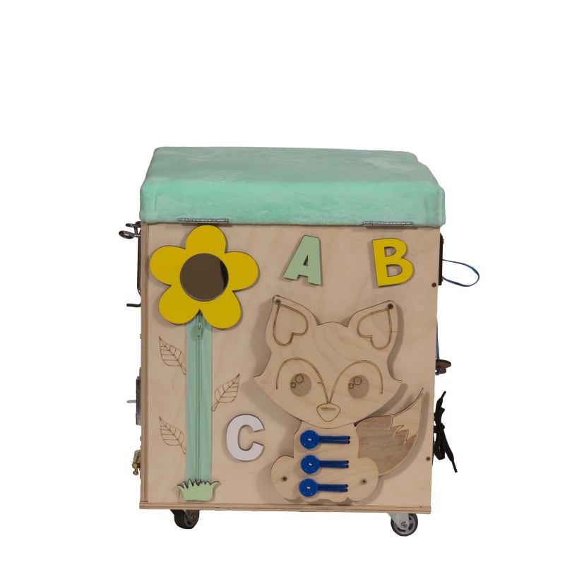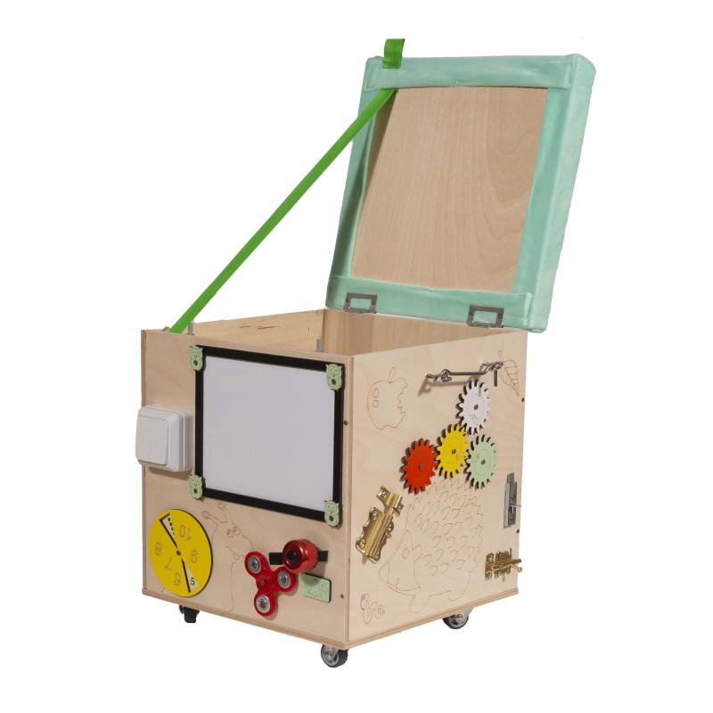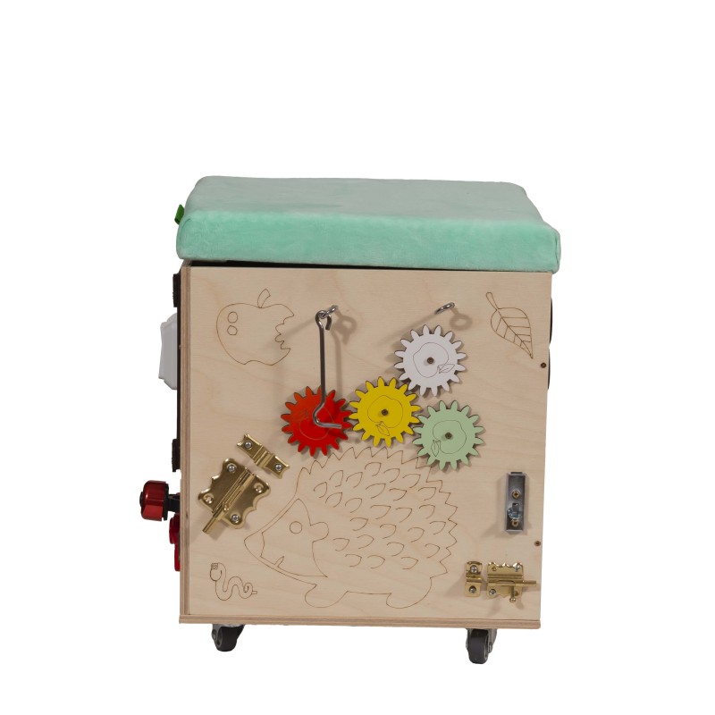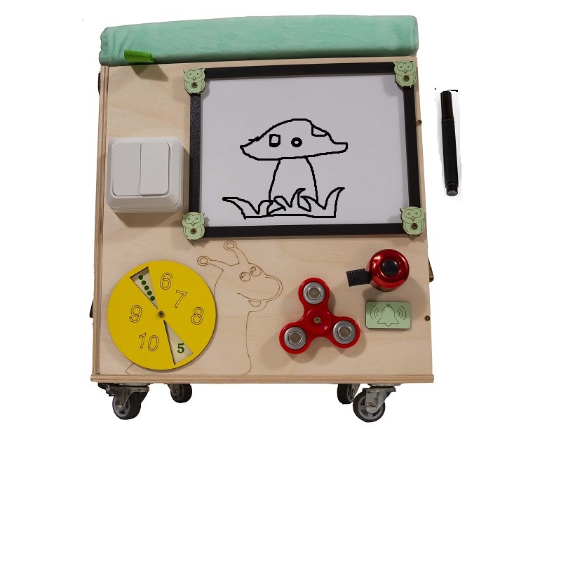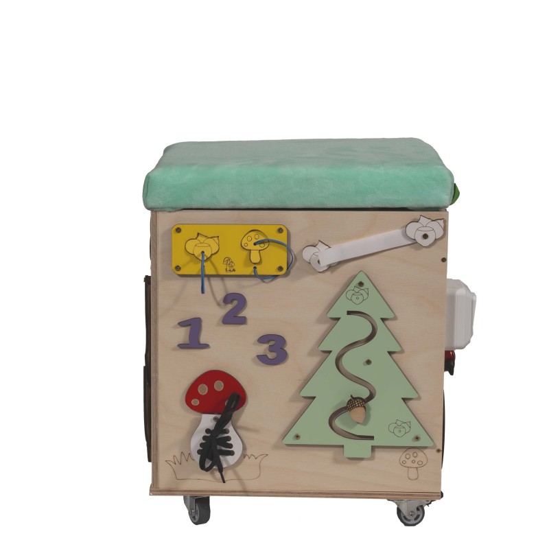 interaktywna tablica manipulacyjna – elementy interaktywne umieszczone na pufie pobudzają ciekawość dziecka i zachęcają do zabawy