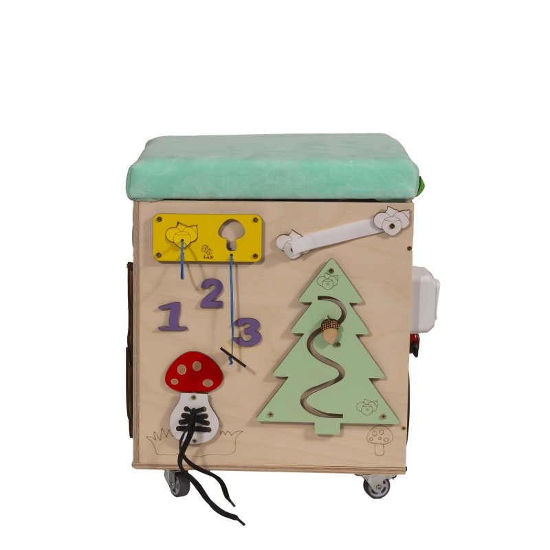 Największą atrakcją pufy są jednak interaktywne elementy, które zamieniają ją w prawdziwą tablicę manipulacyjną. Liczne suwaki, sznureczki i inne sensoryczne detale pobudzają wyobraźnię malucha i zachęcają do zabawy.